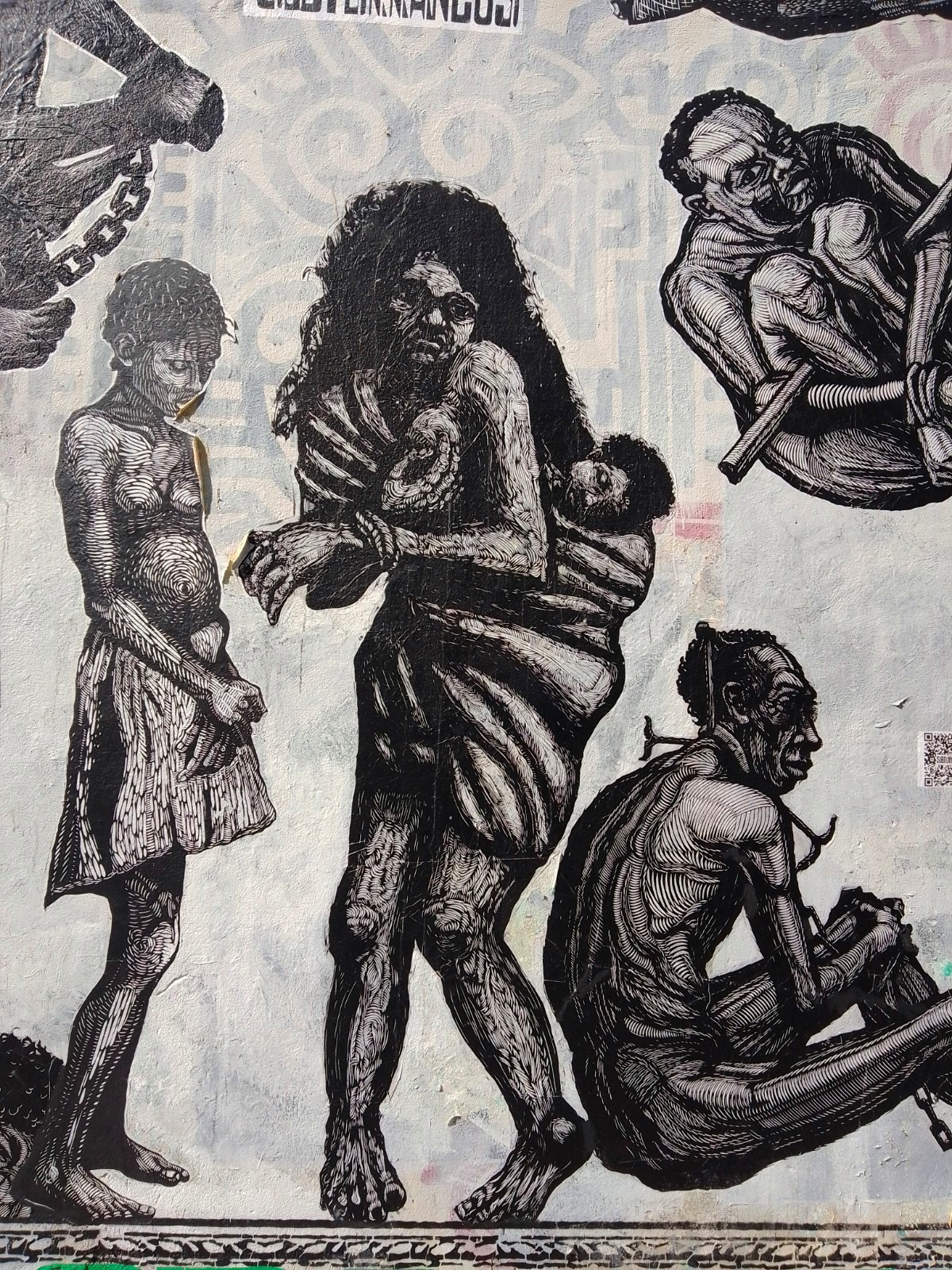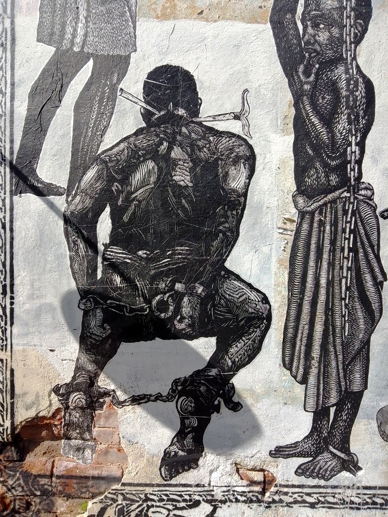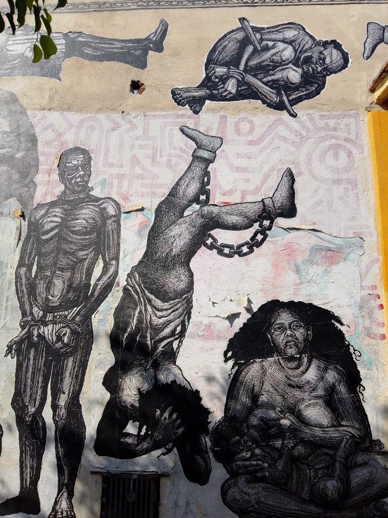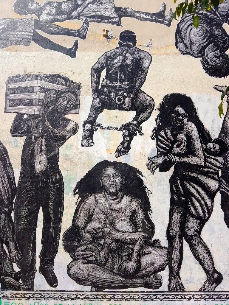 Par exemple, l’œuvre monumentale Diaspora noire, 500 ans d’esclavage (en ouverture de cet article et dans le diaporama). Cette œuvre, en accord avec le propriétaire du bâtiment, a été faite de jour en 10 heures, de midi à 20 heures, avec un petit groupe d’artistes bénévoles. Ce fut le premier projet puis chantier du collectif. Également sur la façade de Toro, située rue Morelos comme l’atelier, où pendant un an on a pu admirer des portraits illustrant différents caractères et émotions comme la colère, la folie, l’espoir, la peur (voir ici)… Mais en général, après un appel à participation au sein du collectif, l’affichage se fait sans demander de permission, plutôt de nuit.