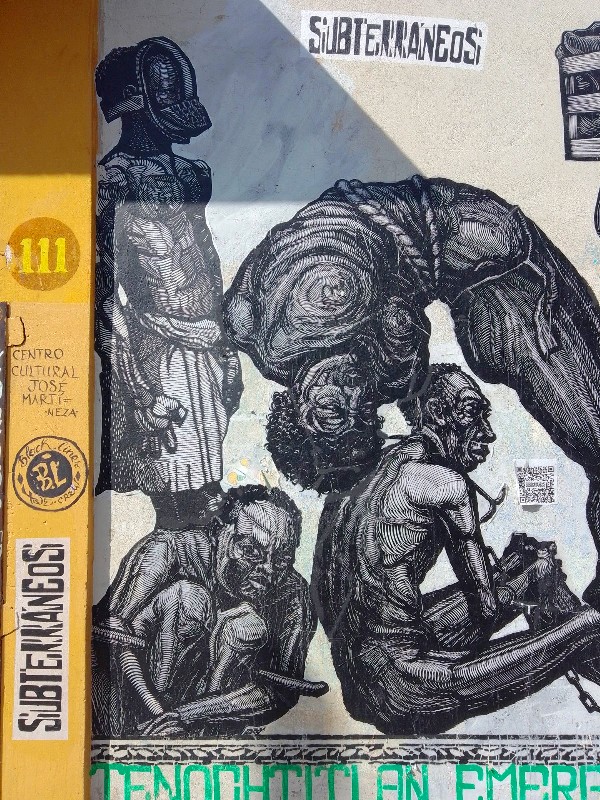 Le nom du collectif est venu naturellement, car selon Mario, l’Art doit pouvoir rendre visible et dénoncer. « Subterraneos » signifie ceux d’en bas, les invisibles, exploités, les oubliés. Mario avait proposé « Subterraneos de la Liberdad », dans le sens d’émancipation de l’humanité, mais est resté un seul mot. Le logo du collectif est une plaque d’égout stylisée, comme une descente dans les profondeurs humaines, les combats sociaux souterrains et la lutte des classes de plus en plus invisibilisés à Oaxaca ; comme d’ailleurs dans tout le Mexique de 2023, en plein boom économique pourtant freiné par une très forte inflation, un pays qui continue d’être pétri de fortes inégalités, égoïsmes et injustices.
