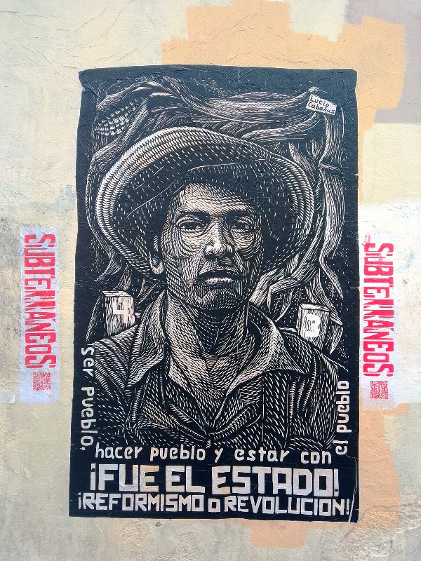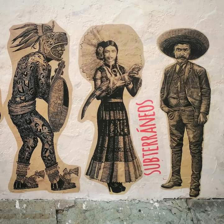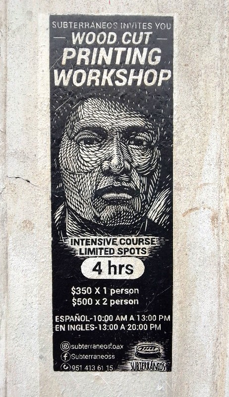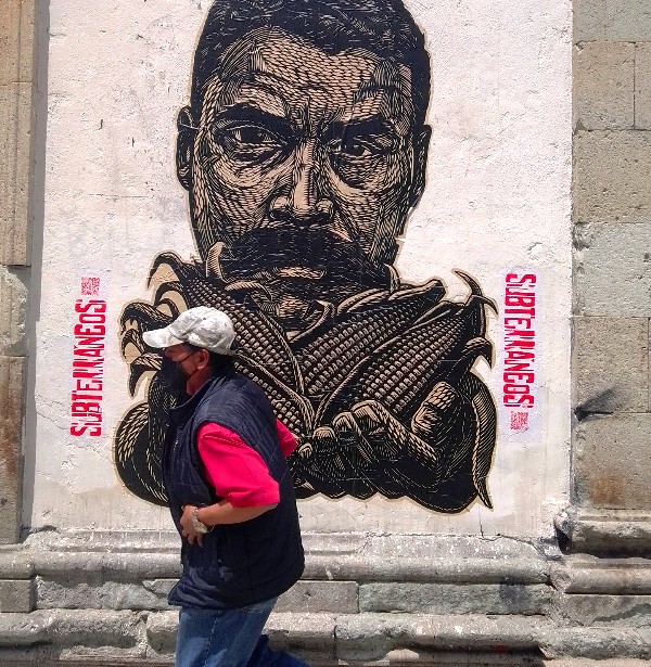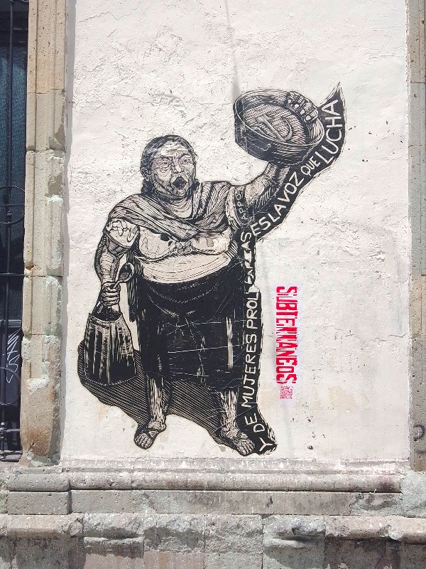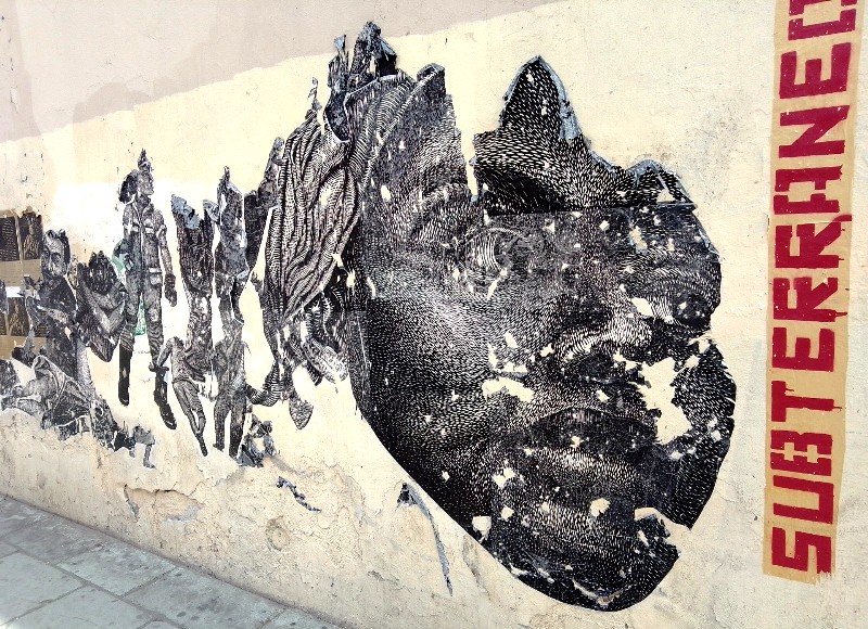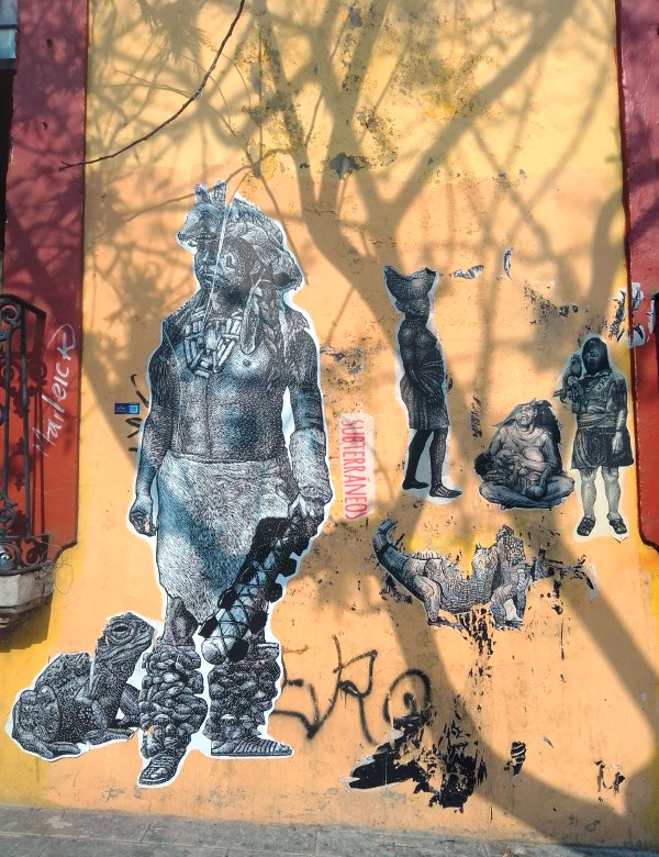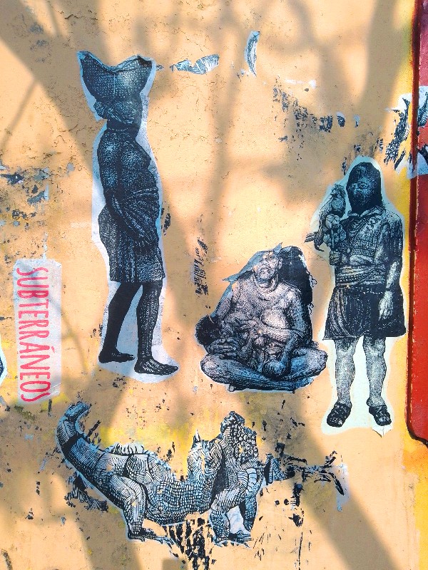 Subterráneos, qui est aussi un collectif, expose publiquement et gratuitement des collages de format moyen à gigantesque, composés de fines gravures faites sur des planches en bois. Ce sont surtout des représentations réalistes de personnages d’inspiration rurale qui se déploient et se dupliquent dans toute la ville – dans le centre historique, objet de beaucoup d’attention touristique et culturelle, mais aussi dans les quartiers résidentiels et populaires éloignés, les villages. Subterráneos propose à la vente aux particuliers la même production vue dans les rues de Oaxaca, mais numérotée et encadrée, dans son espace situé au numéro 403 de la rue Morelos, où sont également organisées continuellement des formations pour les artistes graveurs.