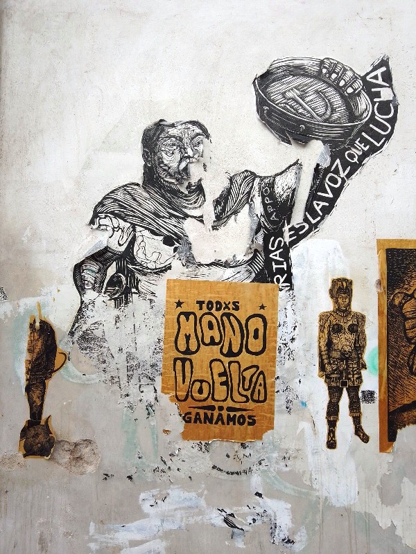 Depuis 4 ans, lapartmanquante suit avec intérêt la production que nous offre l’atelier de gravure Subterráneos, au rythme de ses vagues régulières d’expositions urbaines thématiques. Plusieurs publications Street art à Oaxaca de ce blog sont en effet illustrées par des œuvres monochromes, en noir et blanc, exclusivement imprimées sur papier blanc ou café, parfois rouge-orangé, provenant de cet atelier. Cette forme d’exposition dans la rue, sur les murs de bâtiments coloniaux ou modernes est nécessairement éphémère en raison de son exposition à la pluie et au soleil, au vent, à la différence des fresques murales peintes, ce qui donne parfois avec le temps l’impression d’une peau qui se décolle des façades, de différentes couches graphiques qui se superposent, s’effacent et se recomposent, le sentiment d’une ville-pasimpseste.