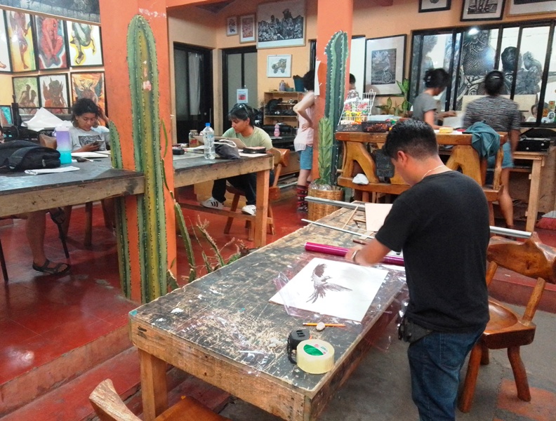 Peu à peu le commerce local s’est déplacé des quartiers du centre-ville les plus prisés pour laisser la place à une économie de tourisme à la fois élitiste et de masse. Mais en même temps se sont implantés des ateliers, des espaces culturels autonomes, en autogestion qui doivent pour survivre s’adapter aux changements de la ville et imaginer de nouvelles réponses. En 2006, une phase de contestation sociopolitique intense a eu lieu à Oaxaca : une guérilla urbaine historique avec des pillages, des victimes civiles tuées par les forces de l’ordre ou enlevées, disparues. Dans ce contexte, de nombreux artistes et collectifs ont participé graphiquement tout en manifestant avec la population.