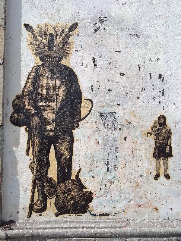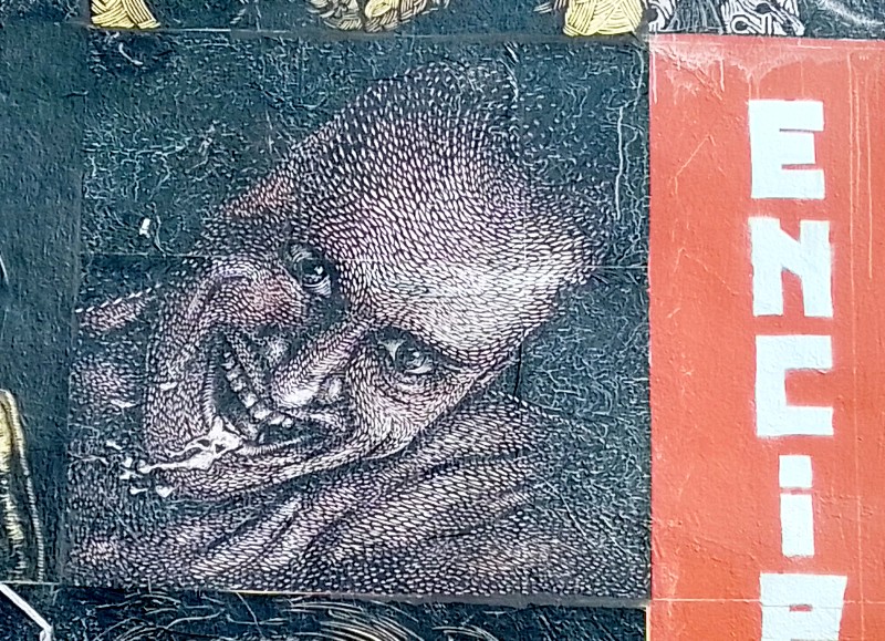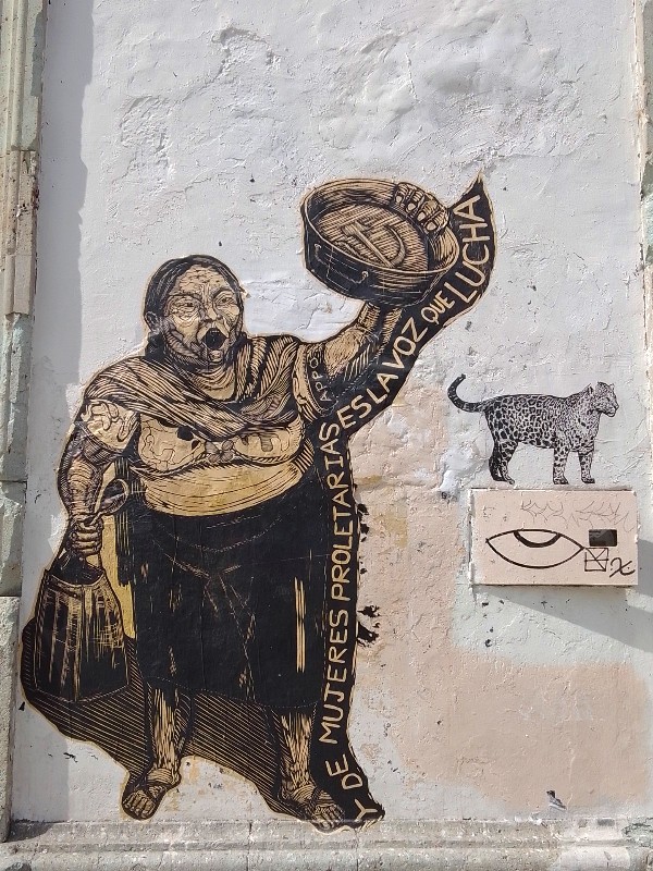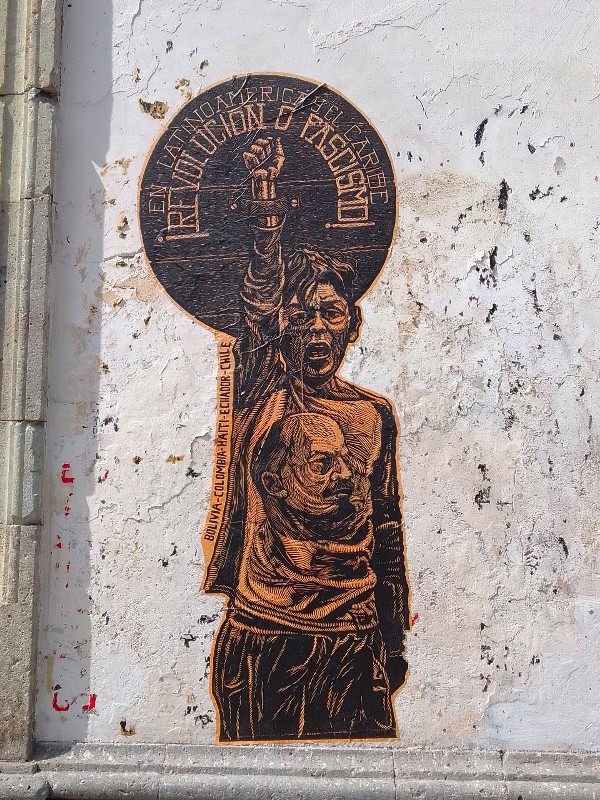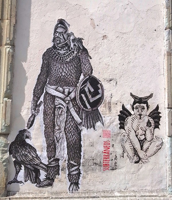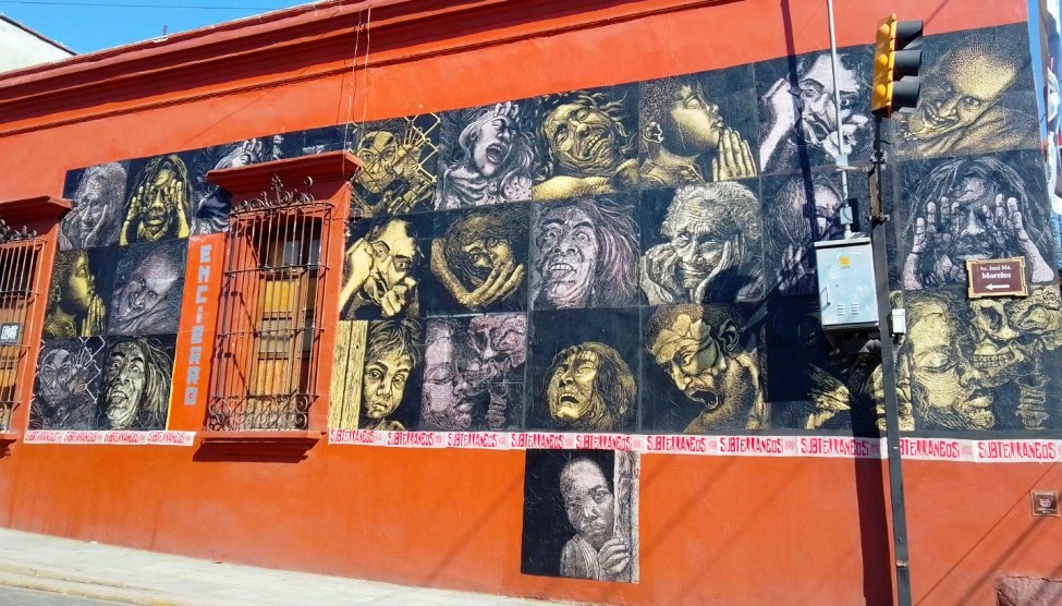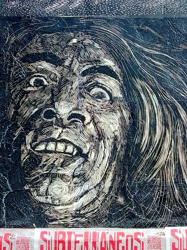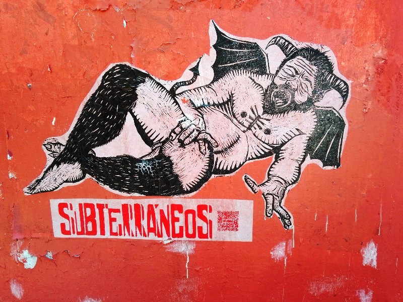 Desde hace 4 años, lapartmanquante sigue con mucho interés la generosa producción que nos ofrece el taller de grabado Subterráneos, al ritmo de sus exposiciones urbanas temáticas. Varias publicaciones de arte callejero en Oaxaca en este blog están ilustradas por obras monocromáticas, en blanco y negro, impresas exclusivamente en papel blanco o café, a veces rojo-anaranjado, procedentes de este taller. Esta forma de exposición en la calle, en las paredes de edificios coloniales o modernos es obviamente efímera debido a su exposición a la lluvia y al sol, al viento, a diferencia de los frescos murales pintados, lo que a veces da la impresión de una piel que se despega de las fachadas, de diferentes capas gráficas que se superponen, se borran y se recomponen, el sentimiento de una ciudad palimpsesto.