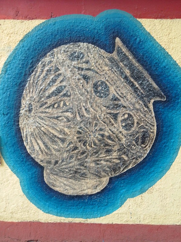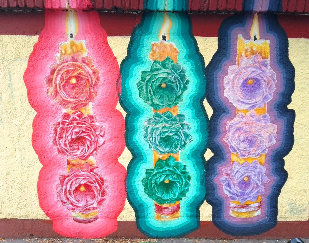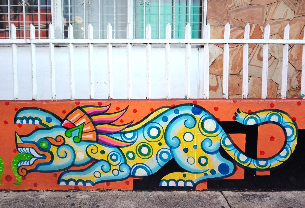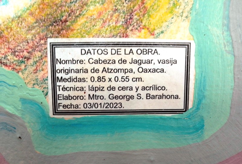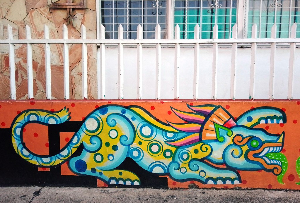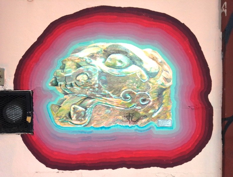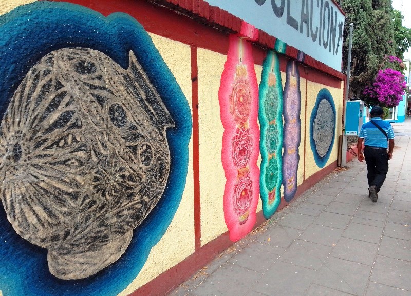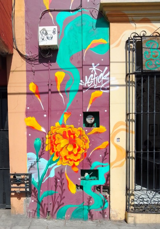 On peut constater de nouveaux styles, moins « street art » et plus Beaux-Arts, comme ci-dessous avec ces œuvres de G. S. Barahona réalisées à la peinture acrylique et au pastel gras, laquées directement sur le mur. Ce sont des natures mortes et des paysages de sies arquéologiques qui mettent en valeur la production artisanale, les motifs traditionnels et la culture locale. C’est aussi une autre manière d’exposer dans la rue, plus perso, avec le nom de l’artiste mais aussi le titre et un contact virtuel indiqué dans un cartel, apposé comme une dans une galerie en bas à droite de l’œuvre. Il y a de plus en plus de trouvailles pour commercialiser l’art à Oaxaca, et les options ne manquent pas, même elles s’élargissent (ou se rétrécissent, c’est selon les points de vues) dans la dynamique du développement touristique et immobilier de la ville : commande de décoration murale dans des restaurants, dans des espaces pour événementiels, chez des particuliers, vente de reproductions – lithographies, sérigraphies ou gravures sous cadre – et dérivés commerciaux dans les magasins arty et bobos du centre-ville.