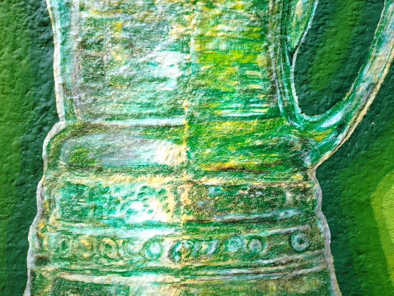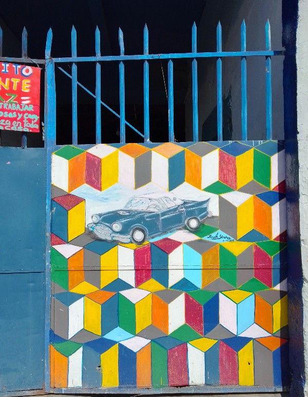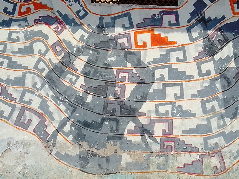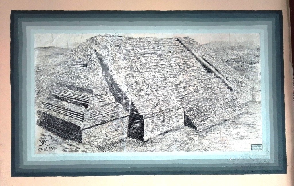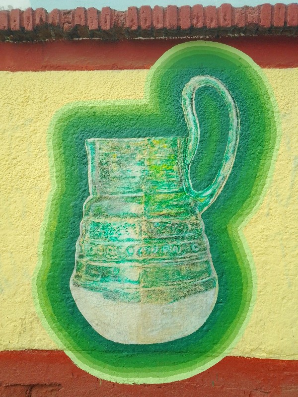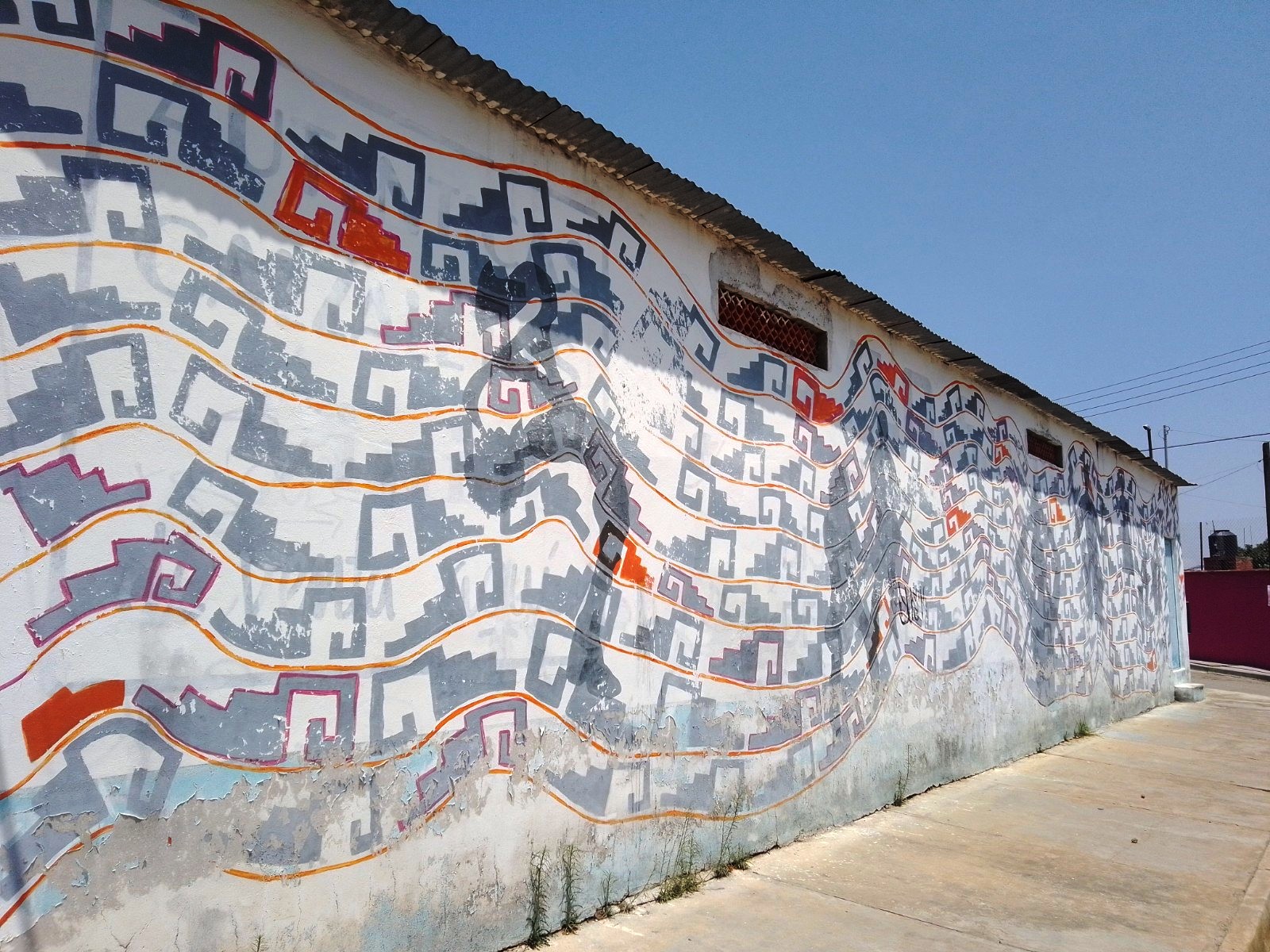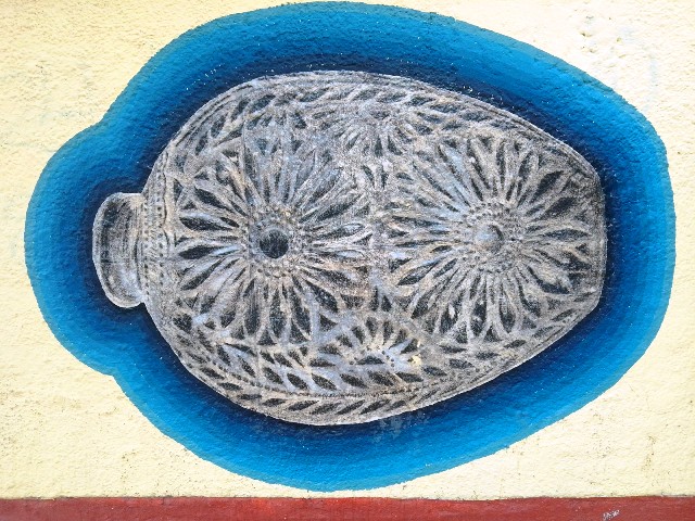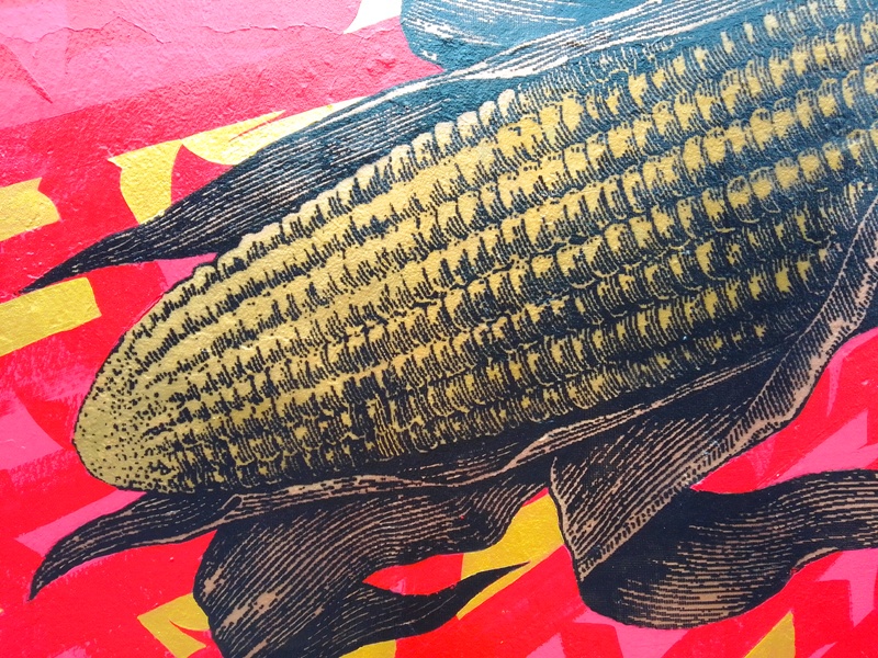 On peut constater de nouveaux styles, moins « street art » et plus Beaux-Arts, comme ci-dessous avec ces œuvres de G. S. Barahona réalisées à la peinture acrylique et au pastel gras, laquées directement sur le mur. Ce sont des natures mortes et des paysages de sies arquéologiques qui mettent en valeur la production artisanale, les motifs traditionnels et la culture locale. C’est aussi une autre manière d’exposer dans la rue, plus perso, avec le nom de l’artiste mais aussi le titre et un contact virtuel indiqué dans un cartel, apposé comme une dans une galerie en bas à droite de l’œuvre. Il y a de plus en plus de trouvailles pour commercialiser l’art à Oaxaca, et les options ne manquent pas, même elles s’élargissent (ou se rétrécissent, c’est selon les points de vues) dans la dynamique du développement touristique et immobilier de la ville : commande de décoration murale dans des restaurants, dans des espaces pour événementiels, chez des particuliers, vente de reproductions – lithographies, sérigraphies ou gravures sous cadre – et dérivés commerciaux dans les magasins arty et bobos du centre-ville.