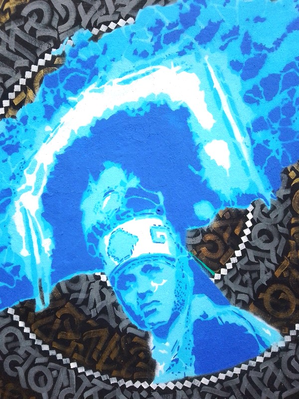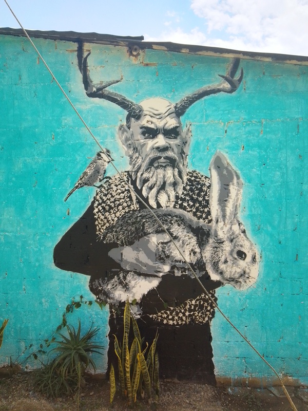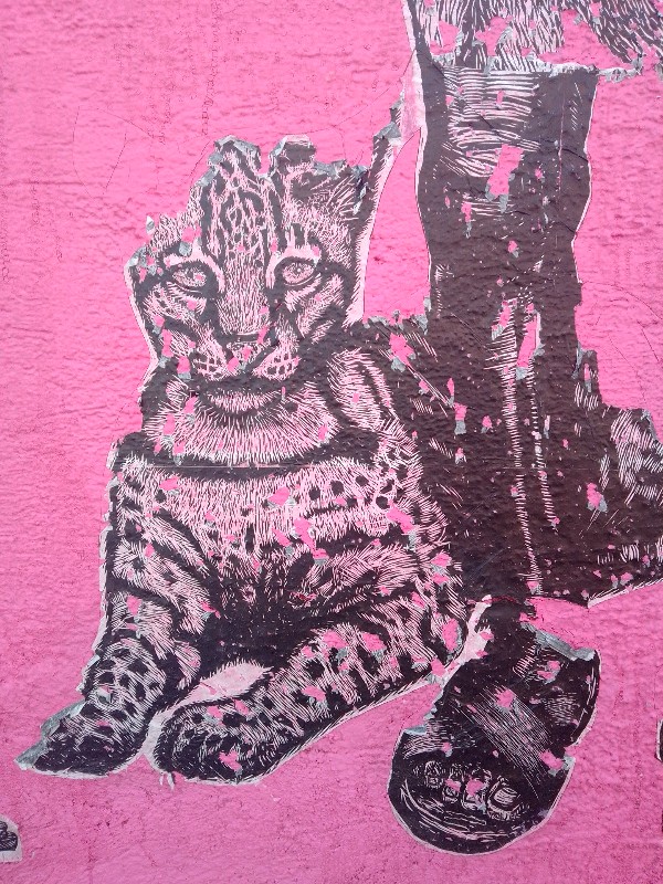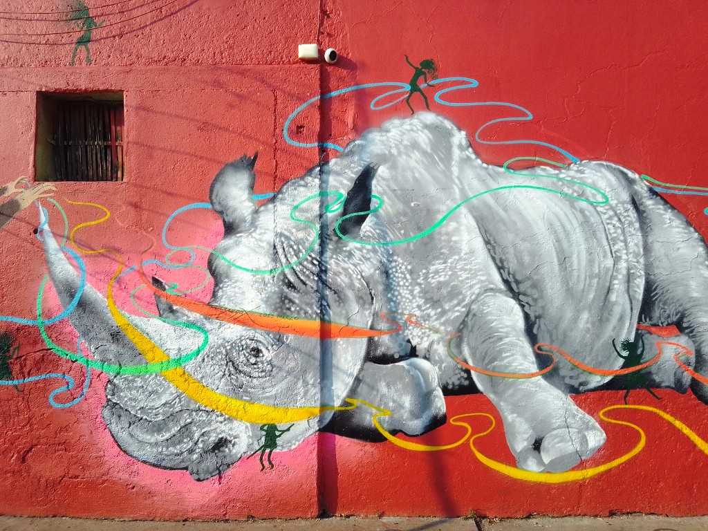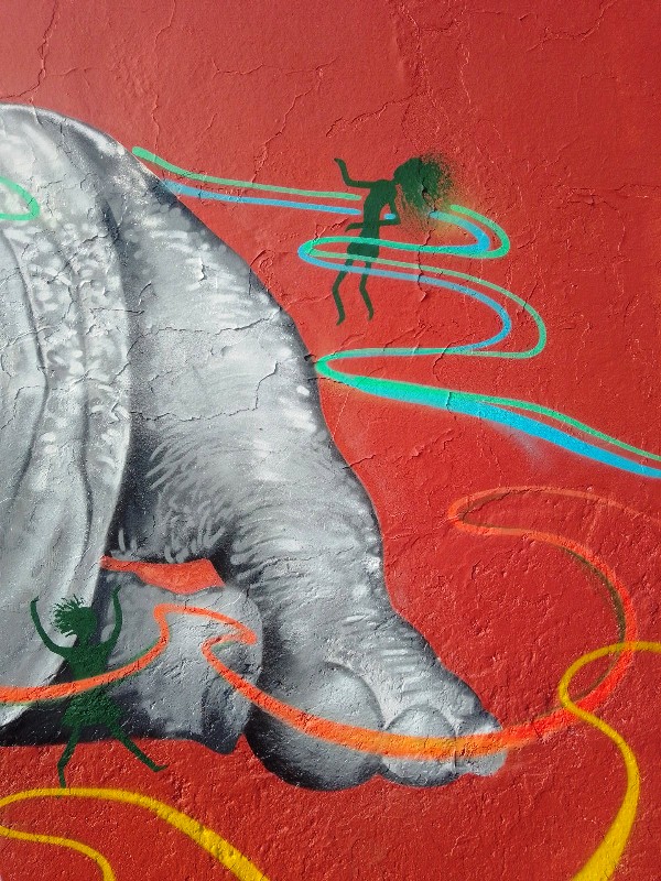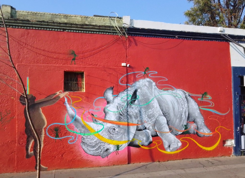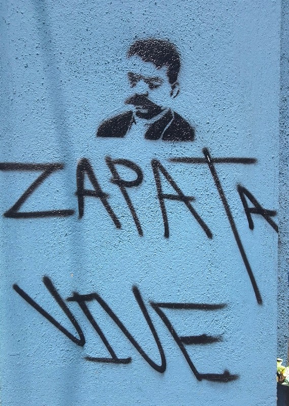 Des Zapatas en veux-tu-en-voilà en pochoir ou en gravure – une caution révolutionnaire mexicaine, un vestige prestigieux, une icône moustachue aussi emblématique ici que Mona Lisa, La Joconde ou Marylin Monroe – ou encore une nouvelle fresque peinte de Viyegax (voir son travail éloquent sur la période Covid19, ici et ). Que représente ce rhinocéros blanc au sol que semble vouloir réanimer un homme nu, un chaman ? Et les joyeuses silhouettes noires qui se baladent sur l’animal ? Je vous laisse faire votre propre interprétation…