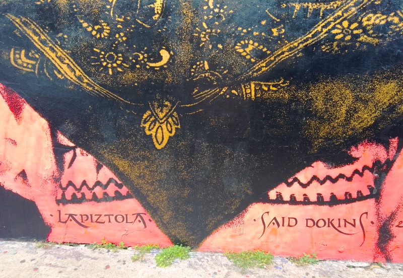 Lapiztola, autre collectif formé par un couple de communicants visuels que lapartmanquante avait présenté en 2012 dans Un front artistique à Oaxaca, existe toujours. Il s’affiche en ce moment avec la grande fresque rouge mise en Une. Mais la technique a changé, ce n’est plus du pochoir monumental finement ouvragé â la main, comme de la dentelle de bristol, mais des œuvres réalisées numériquement et imprimées sur support papier avec une imprimante couleur très grand format.