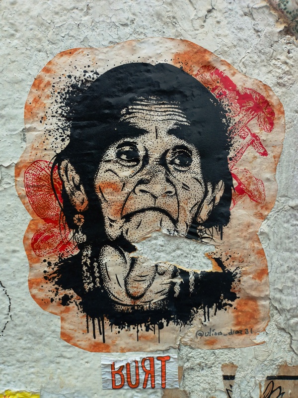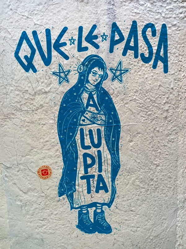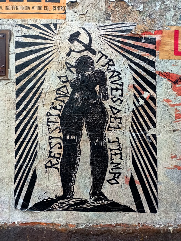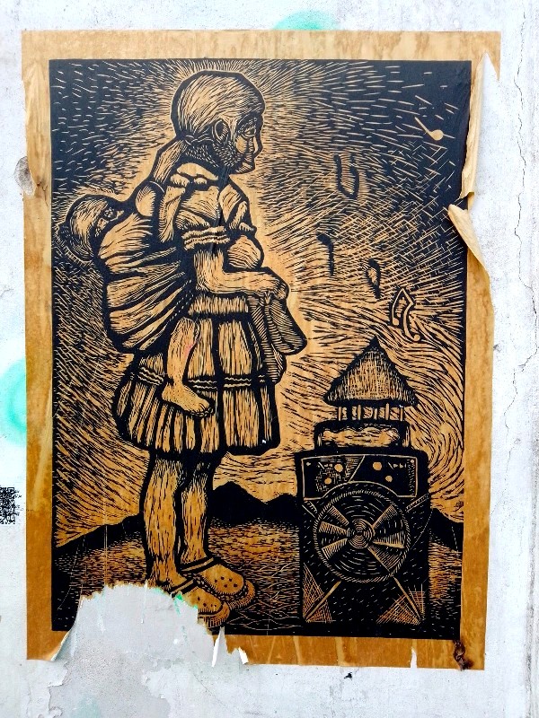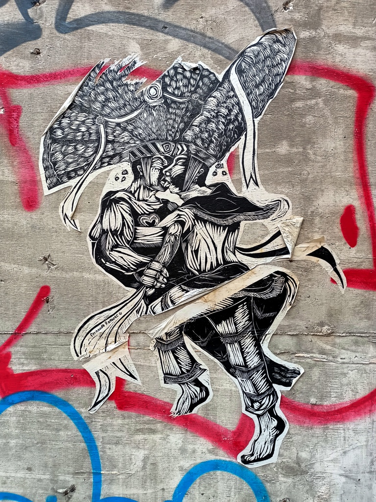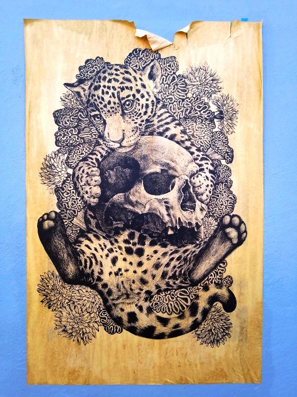 Dernier tour de piste avant décollage… Voici quelques œuvres graphiques, pour la plupart des gravures sélectionnées parmi celles, nombreuses, collées sur les murs du centre historique de Oaxaca. Certaines pourraient rejoindre l’article Une goutte de mezcal… mais pour raison de fin d’inventaire artistique, je regroupe ici les ultimes œuvres qui ont attiré mon attention dans la rue ainsi que dans quelques galeries d’art du centre historico-touristique. Ce sera l’occasion de constituer une liste non exhaustive de lieux où l’on peut revoir mais aussi acheter la plupart de ces remarquables propositions graphiques.