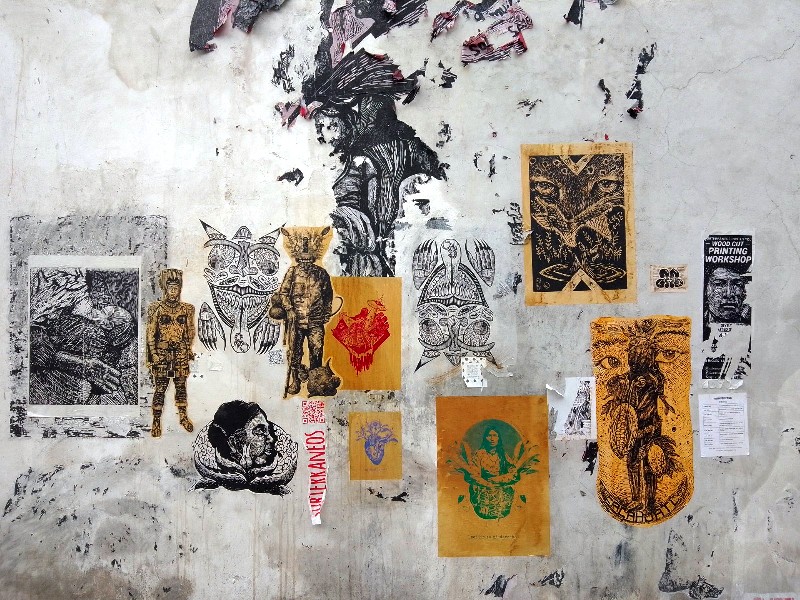 Les œuvres présentées ici illustrent différents thèmes, représentent différentes sensibilités selon différentes techniques : gravure sur bois ou sur lino en positif ou en négatif et sérigraphies. C’est plutôt dans les galeries d’art qu’on peut voir des eaux fortes, des gravures à la taille douce et des lithographies, qui demandent un dispositif technique plus complexe, outre les traditionnels presse et encres d’impression pour n’importe quelle gravure.