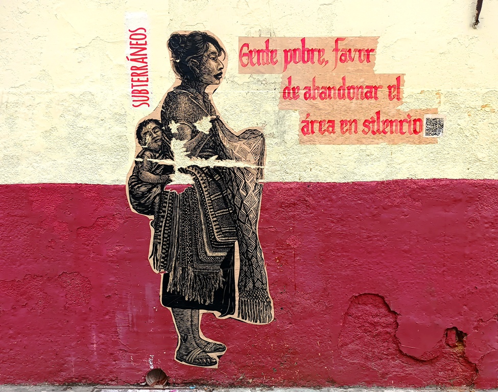 Subterraneos se complait donc dans ses mythes révolutionnaires en mettant en scène l’histoire coloniale du Mexique, mais aussi « des gens du peuple » choisis selon les variétés de costumes traditionnels et en fonction de postures tels que le bon paysan, la vendeuse de fruits, le cultivateur d’agave (celui qui produit le mezcal, l’alcool du pauvre devenu un spiritueux de luxe), bref toute cette catégorie humaine qui a presque déjà disparu du paysage social à Oaxaca de Juárez, mais qui existe encore dans les villages environnants, les municipios, et plaira à l’œil du touriste nord-américain ou européen. Ce même regard qui souhaite voir en vrai les Zapatistes du Chiapas, avec une curiosité compréhensible, bien que fondamentalement asymétrique souvent cynique, dans un positionnement malsain et confortable. Probablement le goût de la dissidence, le désir du risque et de la canaille chers à la bourgeoisie.