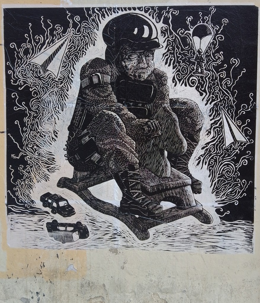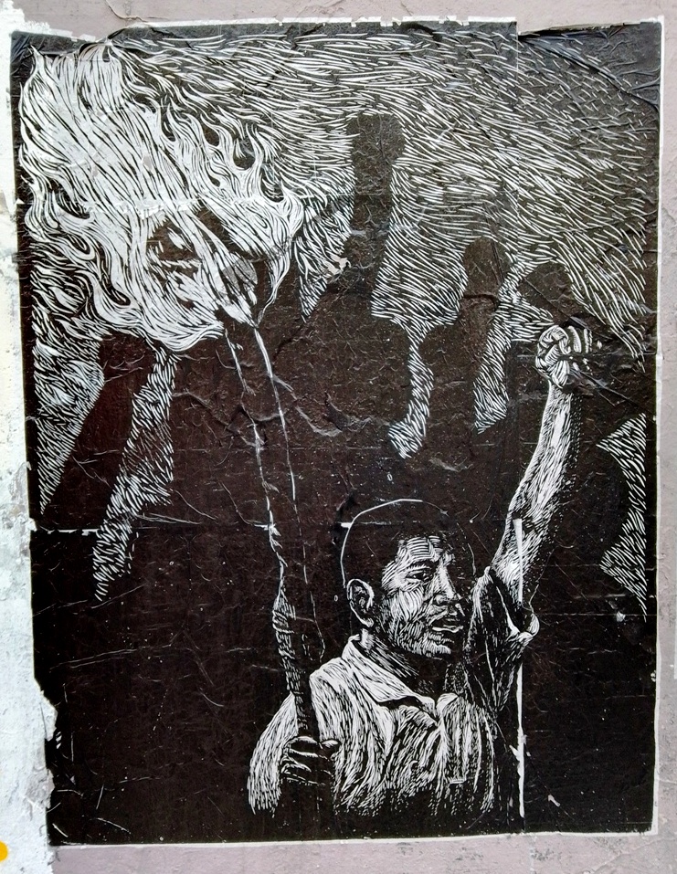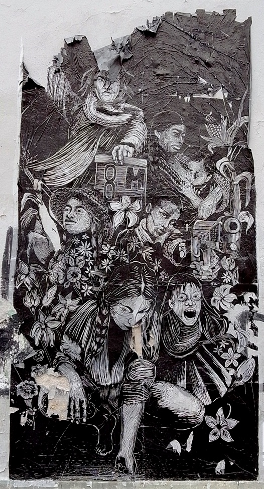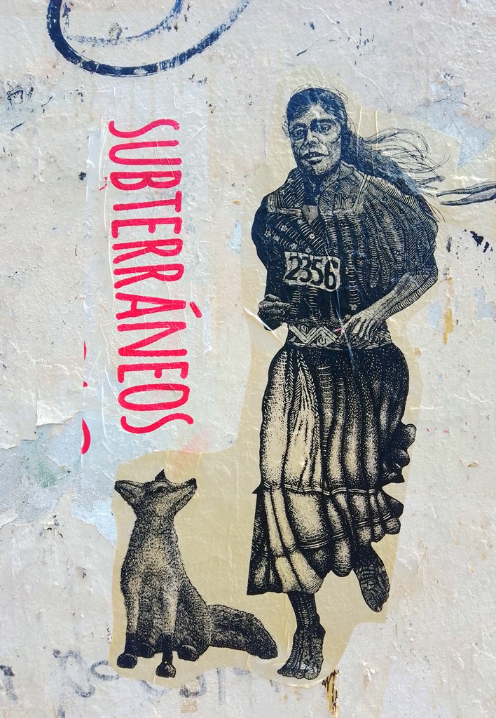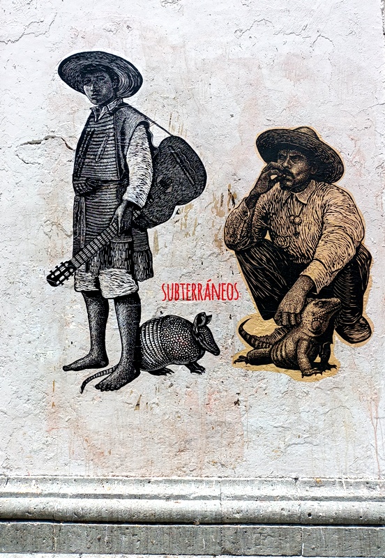 Depuis à peine trois ans d’existence, Subterraneos continue son effort pour dominer le panorama street art en devenant un référent incontournable, avec une production pléthorique et des campagnes d’affichage répétitives mais toujours ambitieuses et de qualité. Il y a une « touche subterraneos » sous l’égide du maestro Mario Guzman indéniable. Cet atelier, tiré par une notoriété internationale qui s’affirme, tourne effectivement en boucle autour de sujets séducteurs, vendeurs et parfois complaisants. Le paradoxe de ce collectif est que tout en dénonçant la « gentrification » du centre-ville de Oaxaca, il y participe pleinement. Jamais par exemple il ne représente, parmi sa panoplie de personnages des gens ordinaires, des figures de tous les jours, de ceux que j‘ai très majoritairement croisés de 2019 à 2013 : employés des restaurants et des hôtels, serveuses, plongeurs, cuisiniers (tous payés au lance-pierre), tous ces riens, ces petites mains qui sont les piliers réels d’une industrie touristique très lucrative. Pas plus que les nombreux visiteurs gays, car dans les coutûmes locales et la doctrine marxiste-léniniste l’hétérosexualité est de mise. De même, l’exploitation dans le sens marxiste d’autres corps de métiers tels qu’employés de banques et de divers commerces, grandes enseignes et supermarchés, ouvriers des chantiers routiers et immobiliers, autrement dit le prolétariat urbain et péri-urbain, n’est jamais évoquée.