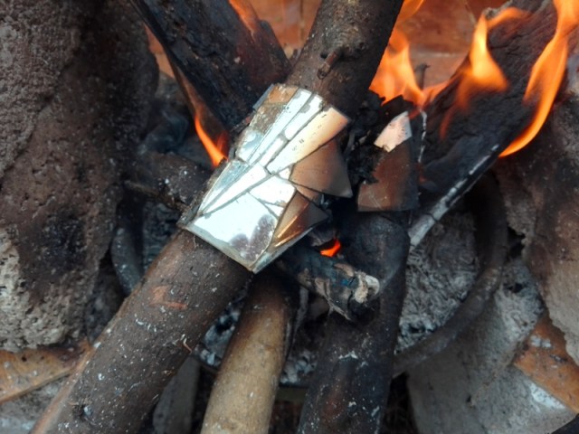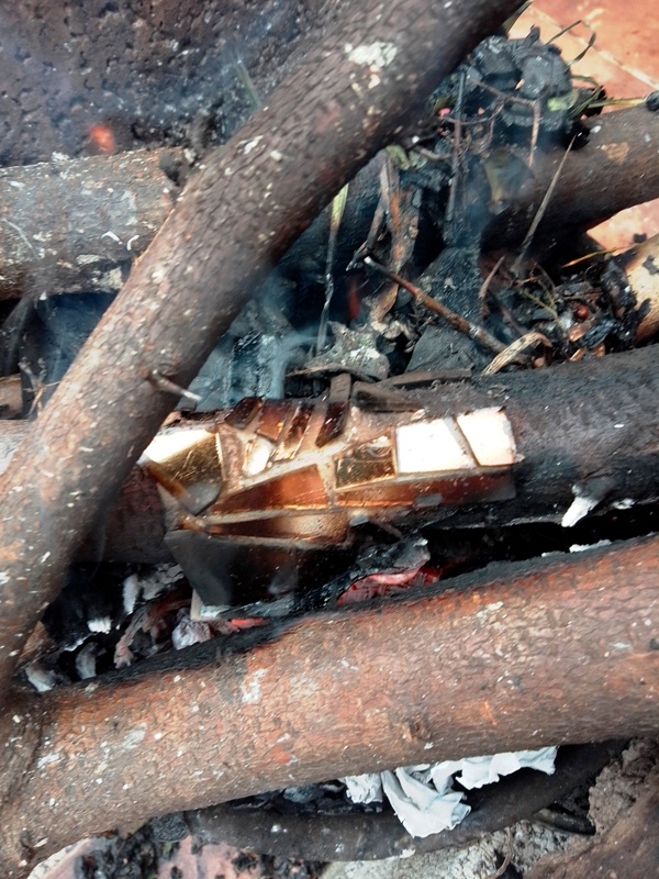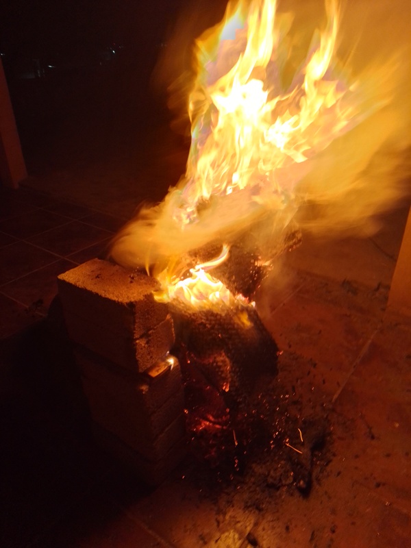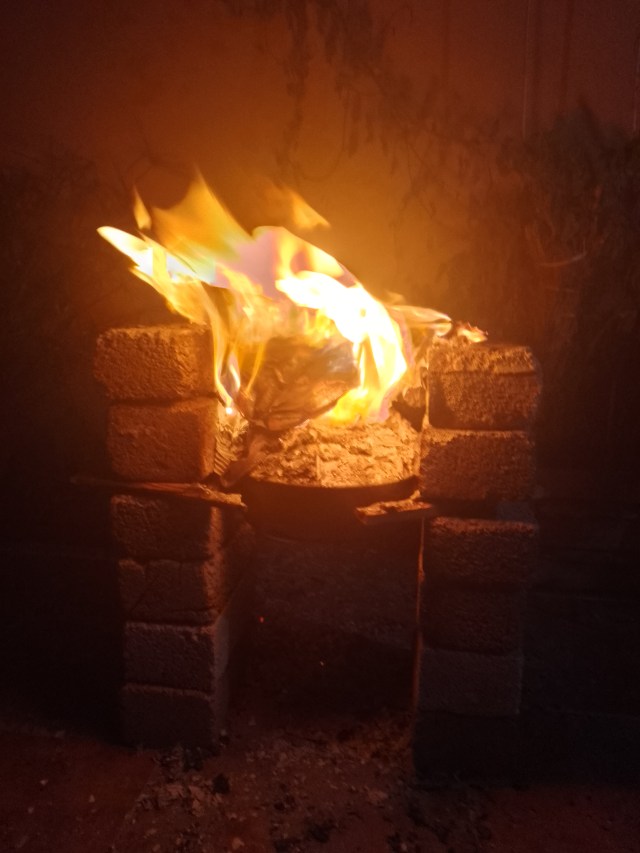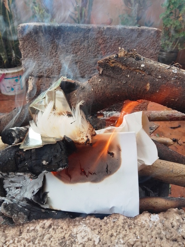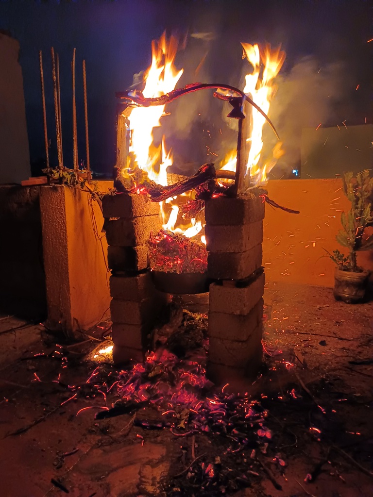 La fabrication de l’autel est en général rudimentaire : deux piles de parpaings pour maintenir un récipient de fer ou de terre qui vont servir de foyer. J’entretiens le feu pendant au moins deux heures, puis le laisse s’éteindre de lui-même. Le lendemain, les braises encore chaudes sous les cendres peuvent servir à le faire reprendre.