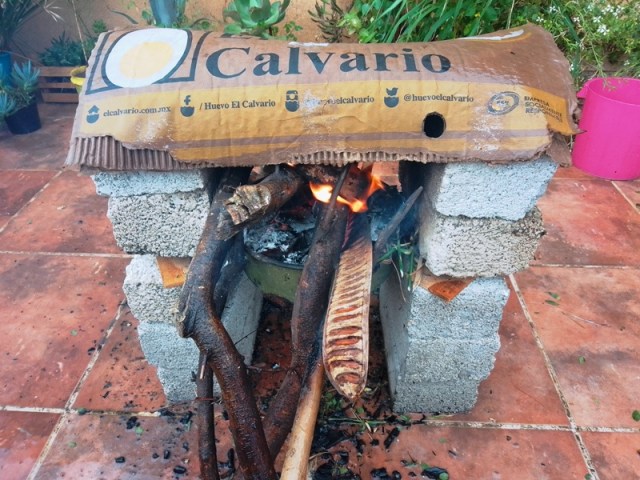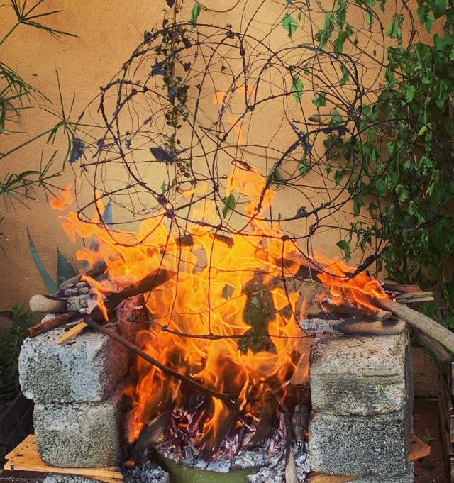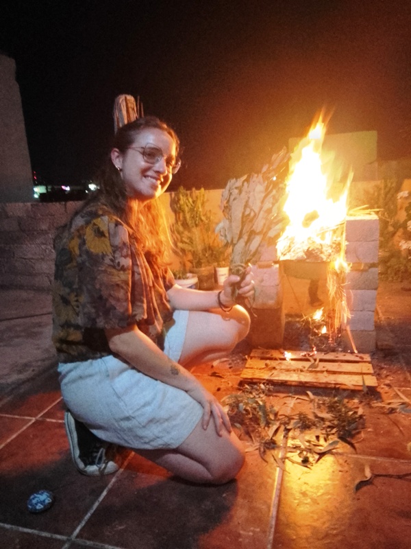 En ce printemps 2022, les fleurs nouvelles ornaient les arbres de Zacatecas et jonchaient les rues, déjà sèches mais toujours odorantes. Fleurs bleu lavande des jacarandas qui s’envolent vers un ciel parfaitement azur, fleurs aux couleurs éclatantes des bougainvilliers, fleurs jaune-orangées d’un jour et si délicates des nopals. Ce sont les offrandes avec lesquelles j‘avais envie d’alimenter le premier de la série des cérémonies du feux inaugurées avec Sarah pendant ces vacances de Pâques. Les rougeoyantes fleurs de flamboyant fleurissant plus tard ne faisaient pas partie du menu. Pour le festival d’arômes naturels, j‘avais ajouté à mon panier des graines roses de pirul, (originaire du Pérou) et des feuilles vert pâle d’eucalyptus (originaire d’Australie), également en fleur avec leur pompons pourpres et allongés.