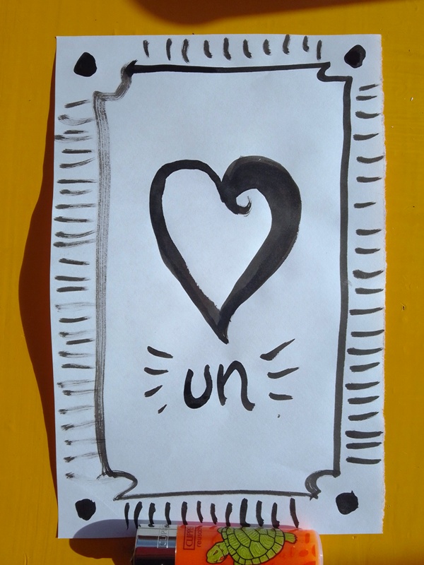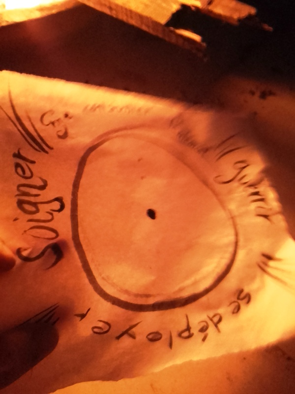 Auparavant, nous avions écrit sur de petites feuilles de papiers blancs les mots et les pensées que nous désirions donner à manger à ce feu. Nous avons utilisé de l’encre de Chine noire et des pinceaux, un mode d’emploi que j‘ai conservé pour les cérémonies suivantes. Pour formuler à l’écrit avec un mot, une ou deux phrases ses espoirs, de la matière symbolique, mais aussi de la substance vitale parmi toutes ces choses dont nous souhaitons nous débarrasser, libérer notre existence. Car la cérémonie du feu est à la fois un acte d’offrande, de respect à la flamme qui nous anime, notre feu intérieur, au feu prométhéen des civilisations humaines qui nous chauffe et nous rend puissants, mais également à l’astre solaire qui nous éclaire et guide nos pas. Ce geste vient peut-être avant tout d’un besoin personnel, d’un désir particulier de purification et de transformation.