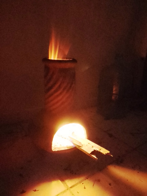 Nous avons procédé de cette manière, simplement, suivant notre instinct et selon certains préceptes appris à la fois de notre expérience mexicaine et de notre pratique de l’art de la céramique. Tout d’abord nous avons allumé le brasier dans le foyer de la cheminée élancée en argile cuite, qui fit parfaitement son office en protégeant notre feu sacré du vent capricieux. Une fois que le feu avait convenablement pris, une belle flamme dansant sur les premières bûches, nous l’avons purifié avec un verre de mezcal et quelques grains de résine de copal. Puis nous avons remercié oralement les quatre éléments – terre, eau, air, feu – de nous être conciliants. Nous avons enfin dédié ce feu au soleil qui disparaissait derrière les tours baroques de la cathédrale, les toits plats des maisons et des palais coloniaux de Zacatecas. Intimement, j‘associais ce feu à la couleur bleue.