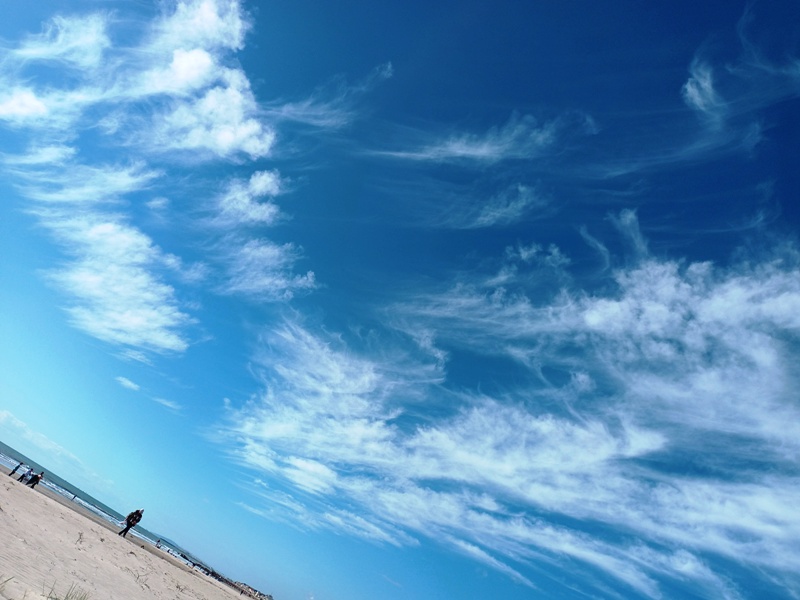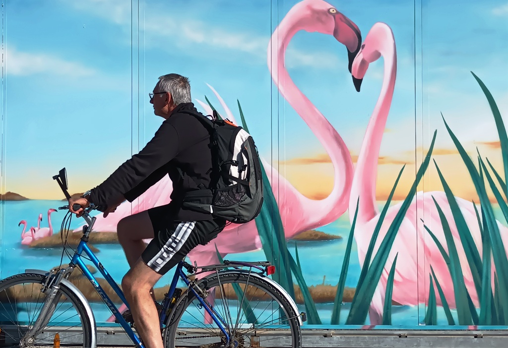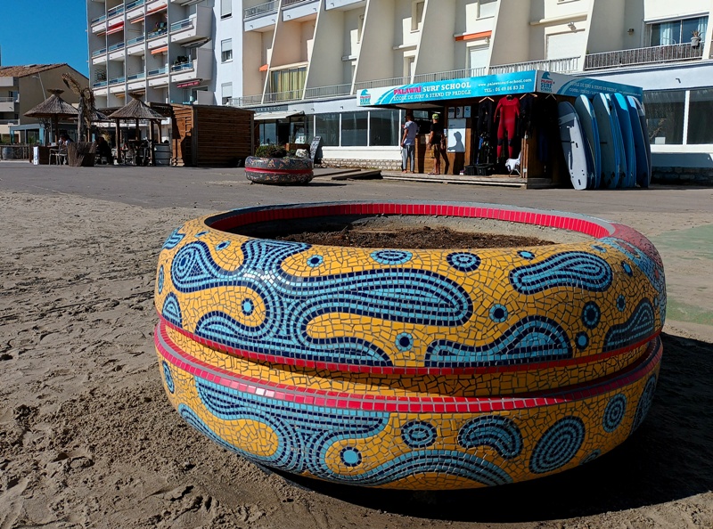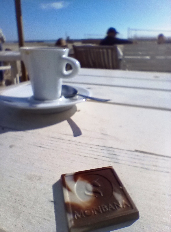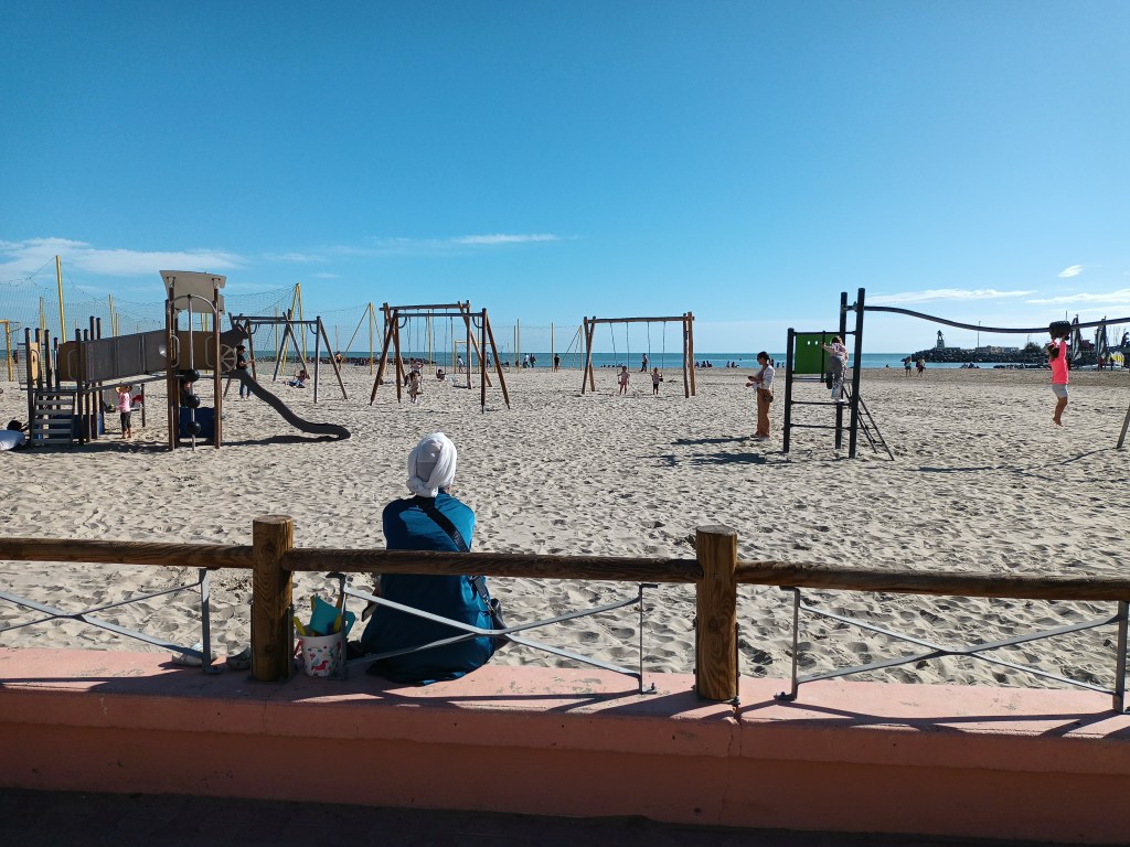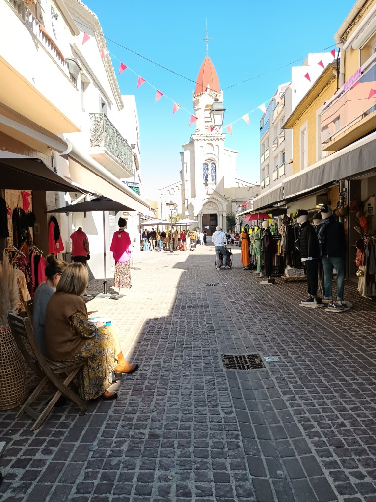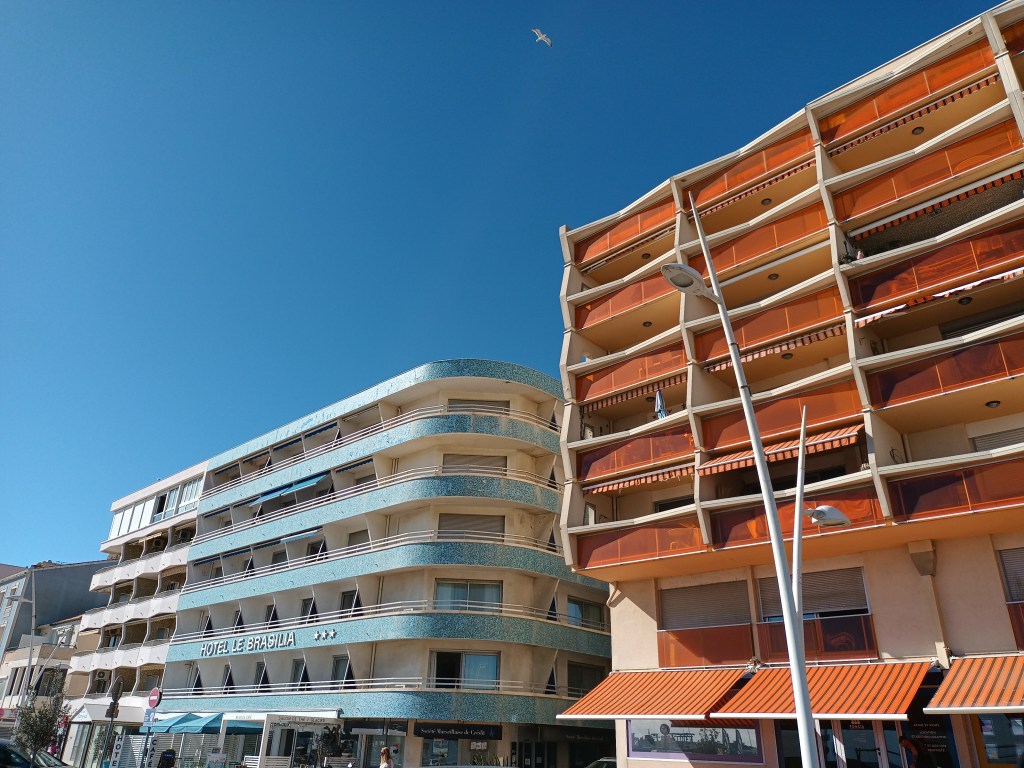 Les pensées s’envolent pendant que le regard plonge un peu partout : la qualité du revêtement de la route, ces troncs noirs et brisés, œuvre d’un incendie récent, un nouvel ensemble d’habitations, une couleur plus vive sur ces ferronneries art nouveau, la netteté matinale sur les collines et quelques brumes qui se dispersent, joli camaïeu de gris-bleu, la douceur inégalée du sable fin. Le corps reprend place dans l’espace, le mental retrouve son aplomb.