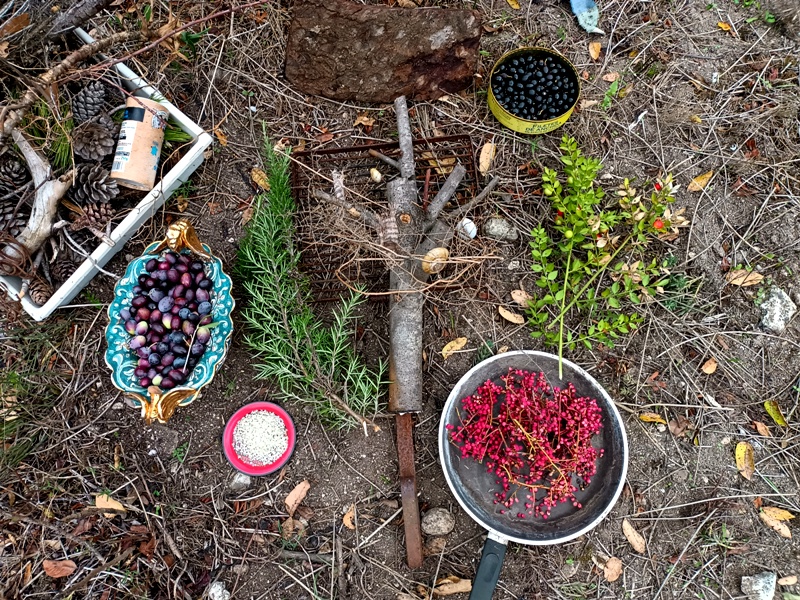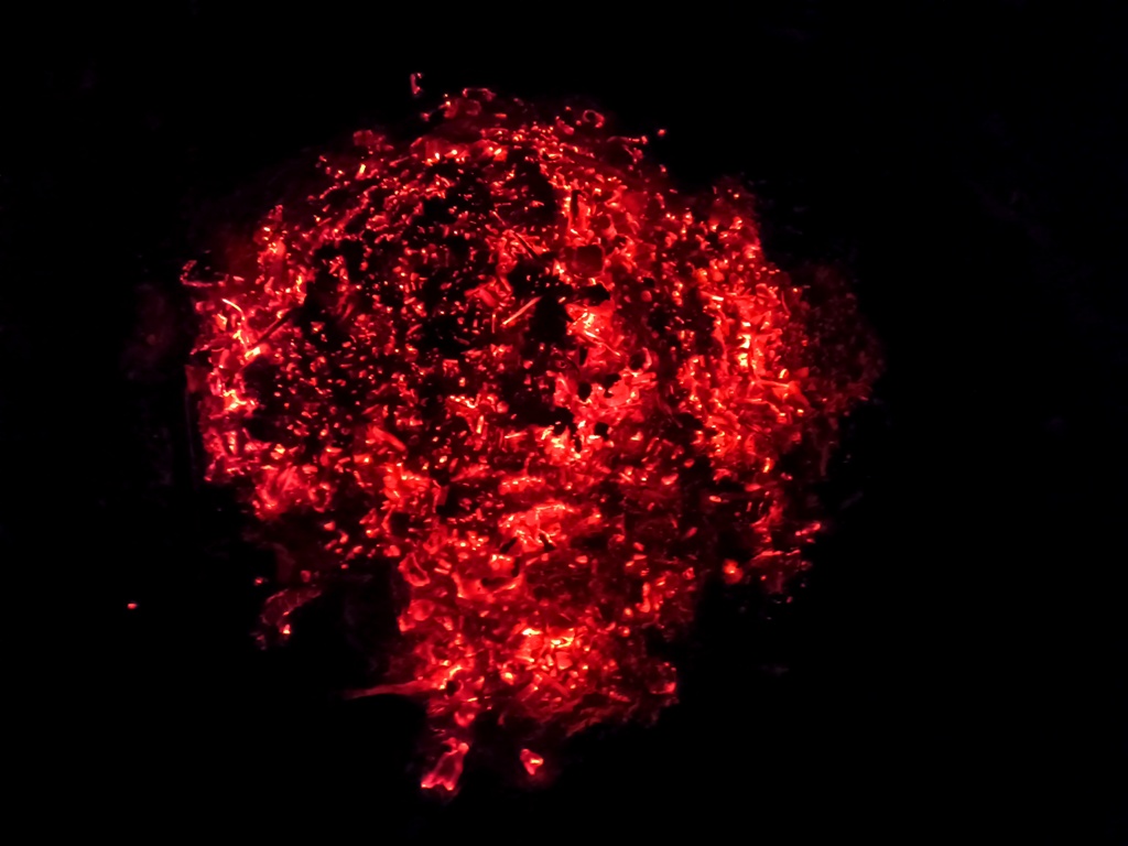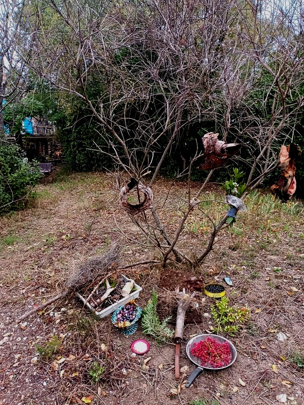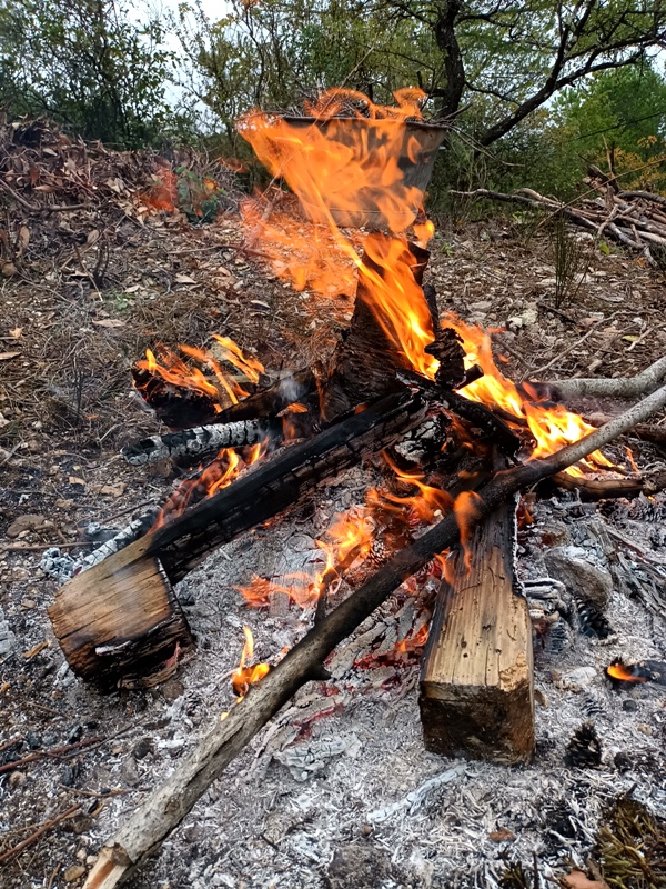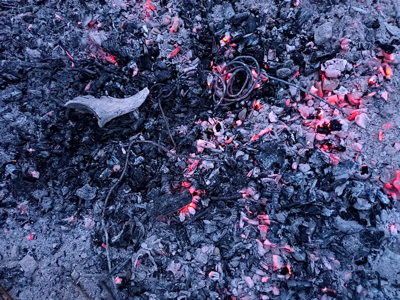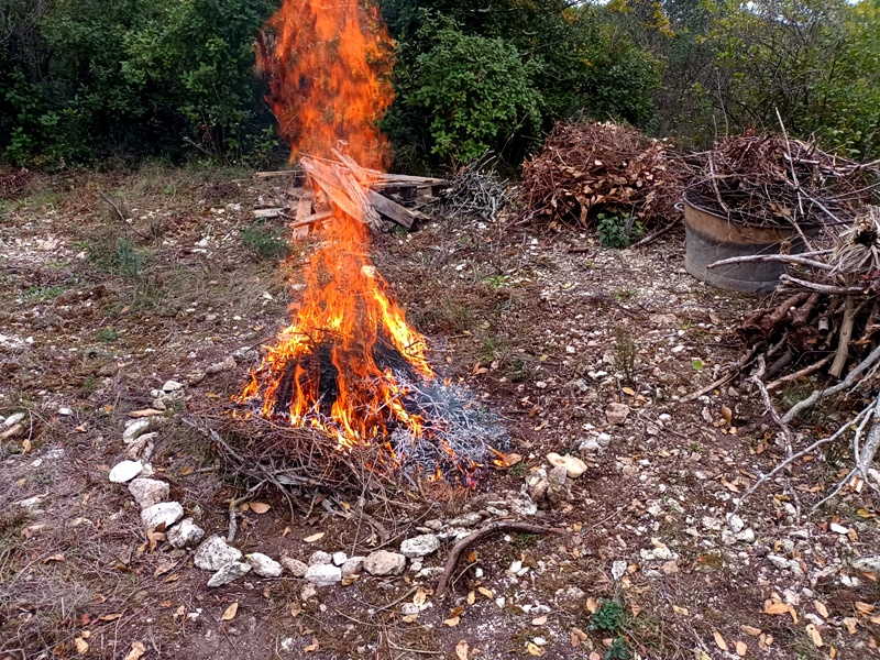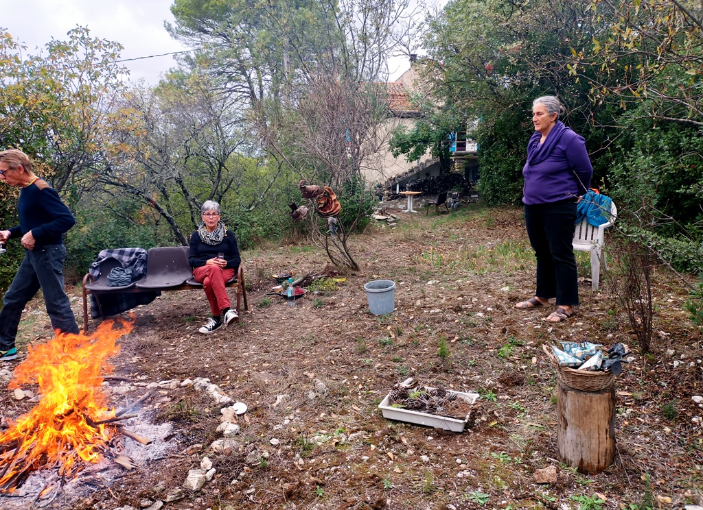 Mais il y eu différentes étapes pour ce 8e feu. D’abord la récolte de combustible et la préparation du site ; puis l’allumage du feu, la purification (à la poudre de cade, un bois de la famille du genévrier qui pousse en Haute-Provence et au bon rhum de La Martinique cette fois-ci), l’adieu aux objets emblématiques, les offrandes, le moment des papiers ; et enfin le repas autour du feu et la veille des braises. Je retiendrai le sacrifice des éléphants jumeaux (offrande à Ganesh), l’histoire de cet oiseau bleu désarticulé qui ne s’est jamais envolé, celle des pensées entortillées et oxydées smbolisées par un fil de fer rouillé, le cadeau aux flammes du masque de peau qui avait fait son temps… Comme offrandes naturelles, nous avons utilisé des olives, du thym, du houx, des graines de laurier et de pistachier sauvage, des pommes de pin. Le combustible principal était constitué de branches de pin, de figuier et de « Monte-au-cieux », en plus de palettes dévorées par les vers. Le tout parfumé d’encens indien et d’eau de lavande fine.