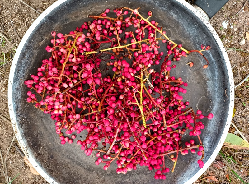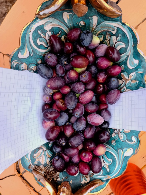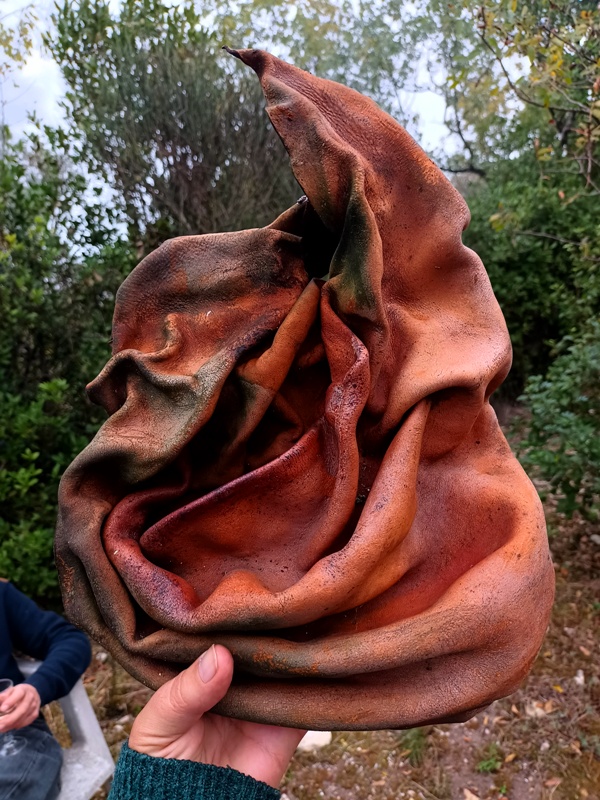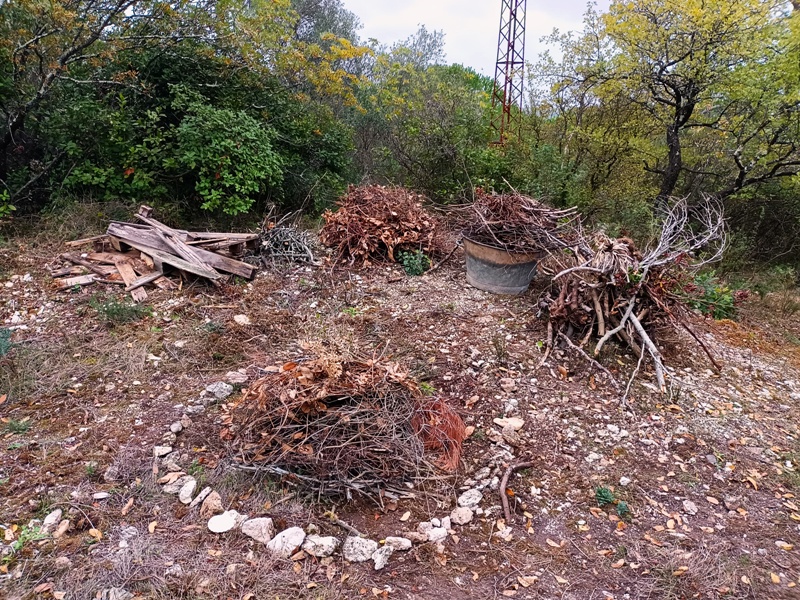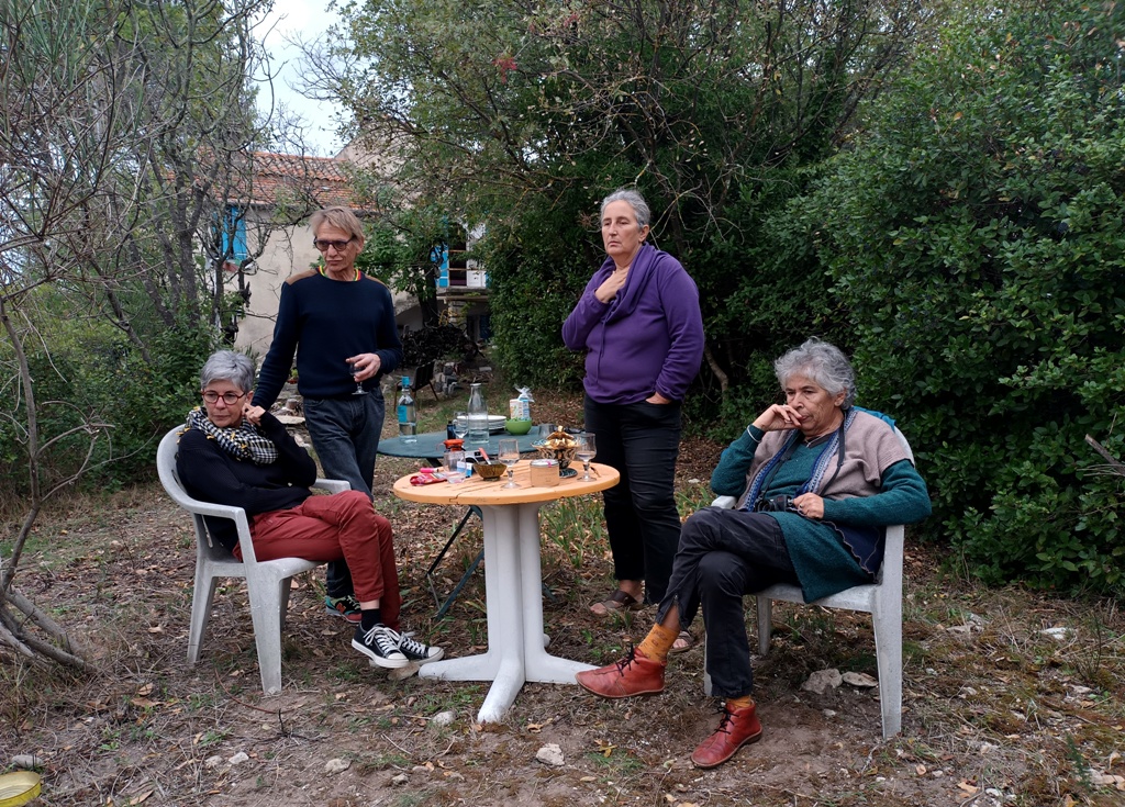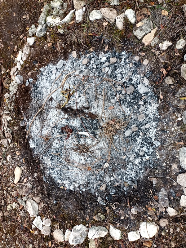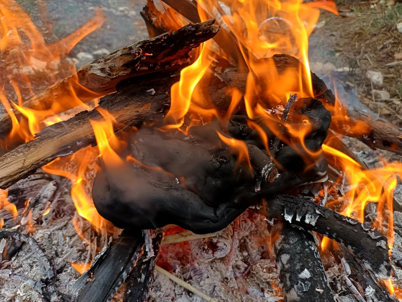 Mais il y eu différentes étapes pour ce 8e feu. D’abord la récolte de combustible et la préparation du site ; puis l’allumage du feu, la purification (à la poudre de cade, un bois de la famille du genévrier qui pousse en Haute-Provence et au bon rhum de La Martinique cette fois-ci), l’adieu aux objets emblématiques, les offrandes, le moment des papiers ; et enfin le repas autour du feu et la veille des braises. Je retiendrai le sacrifice des éléphants jumeaux (offrande à Ganesh), l’histoire de cet oiseau bleu désarticulé qui ne s’est jamais envolé, celle des pensées entortillées et oxydées smbolisées par un fil de fer rouillé, le cadeau aux flammes du masque de peau qui avait fait son temps… Comme offrandes naturelles, nous avons utilisé des olives, du thym, du houx, des graines de laurier et de pistachier sauvage, des pommes de pin. Le combustible principal était constitué de branches de pin, de figuier et de « Monte-au-cieux », en plus de palettes dévorées par les vers. Le tout parfumé d’encens indien et d’eau de lavande fine.