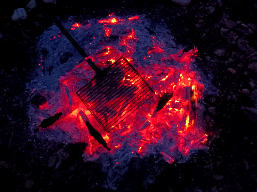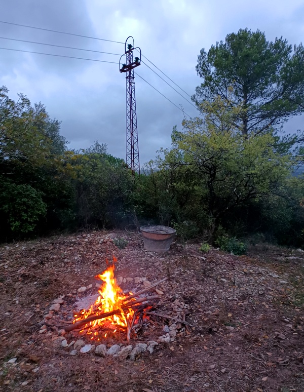 Ce beau feu fut allumé un dimanche où tous les éléments étaient favorables à la cérémonie, à peine avant Halloween et la Toussaint, entre fin octobre et début novembre 2023 – avec une pensée pour Día de Muertos au Mexique qui se déroule à la même époque. Moment idéal pour brûler ce qui résiste, ce que le soleil de l’été n’a pas totalement consumé. Ci-dessus, une grille de fer retient vers la fin de la flambée les souhaits formulés et les escarbilles afin qu’elles n’enflamment pas la garrigue. J’ai organisé cette cérémonie avec des amis du sommiérois, que je salue et remercie ici pour leur participation.