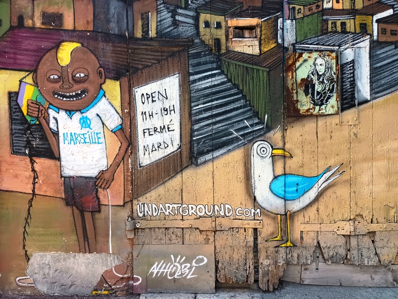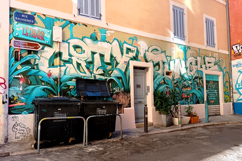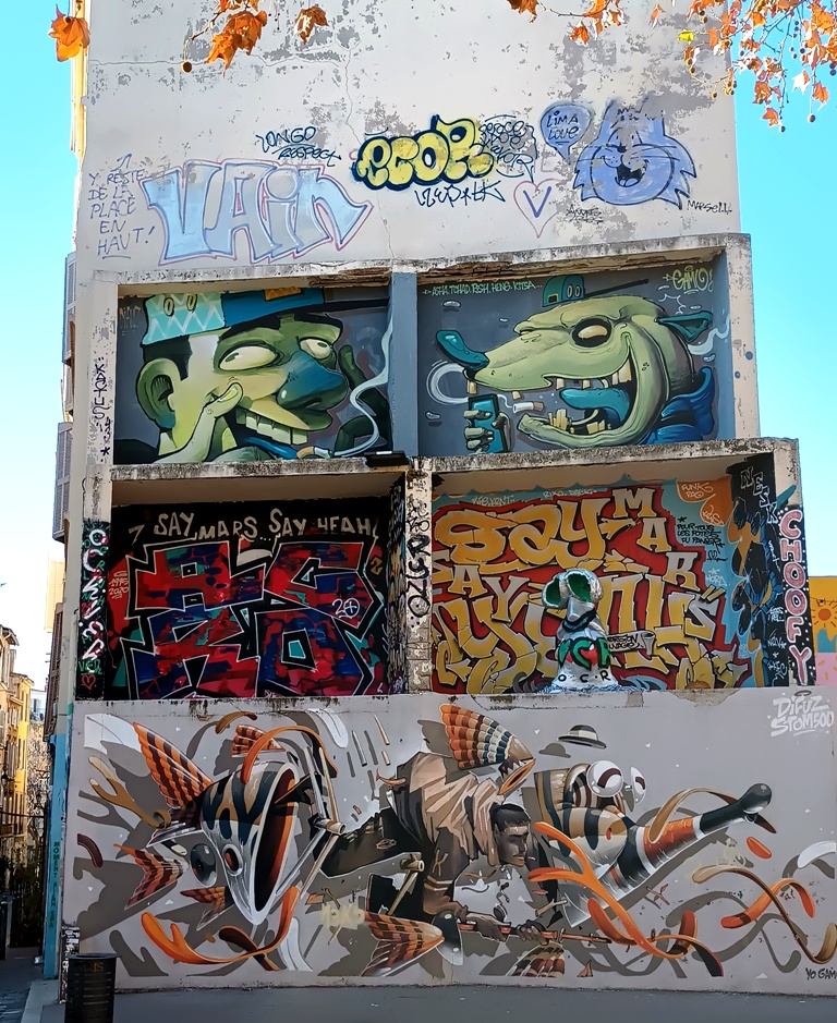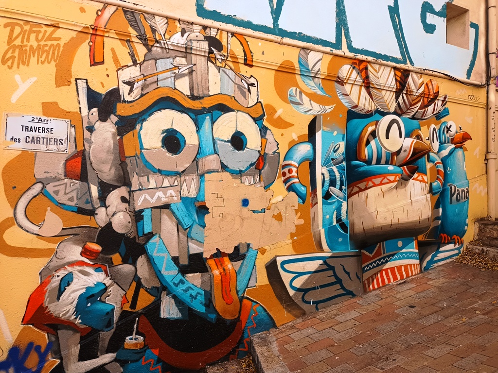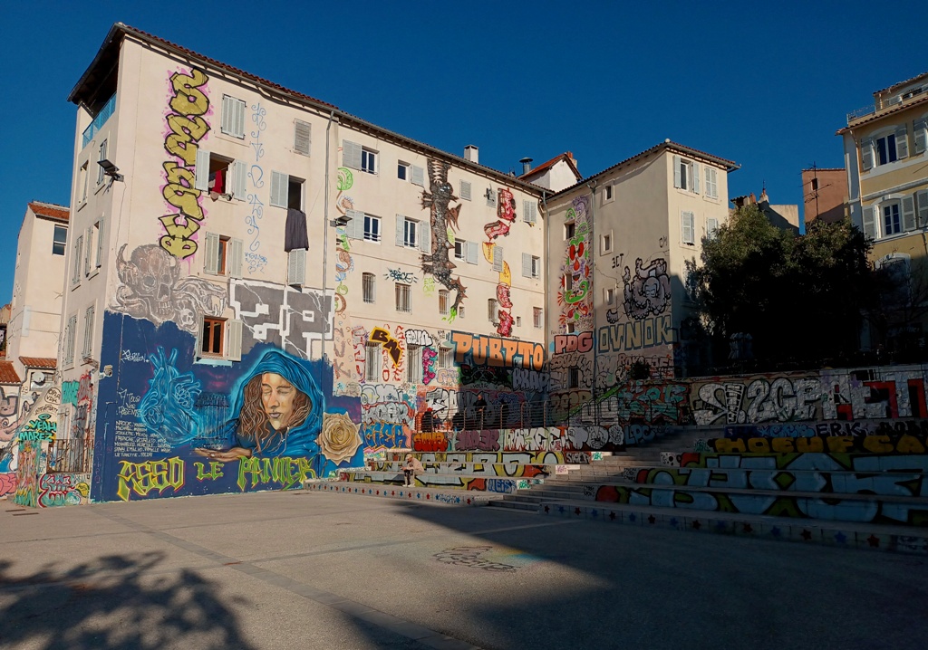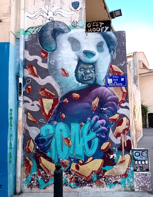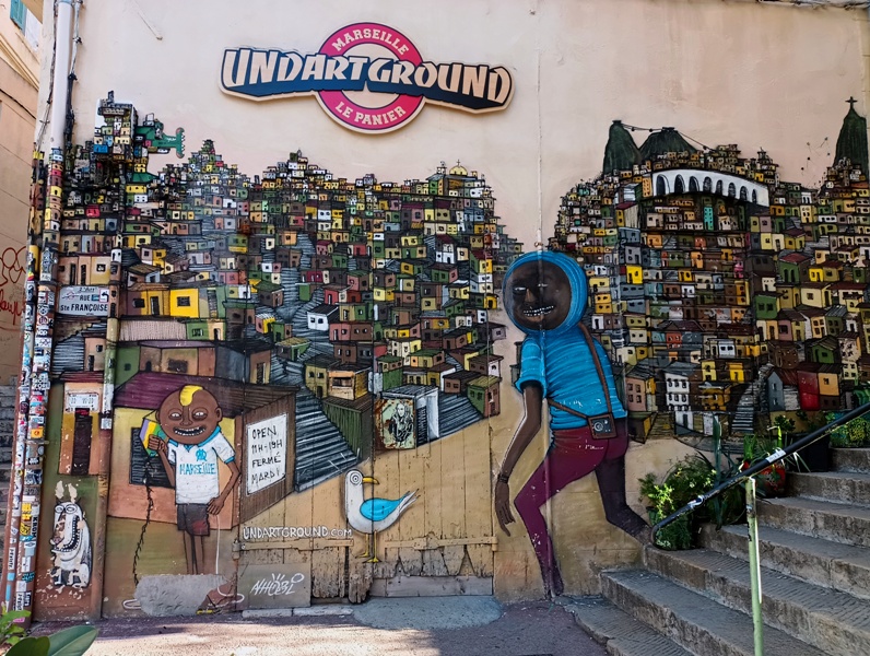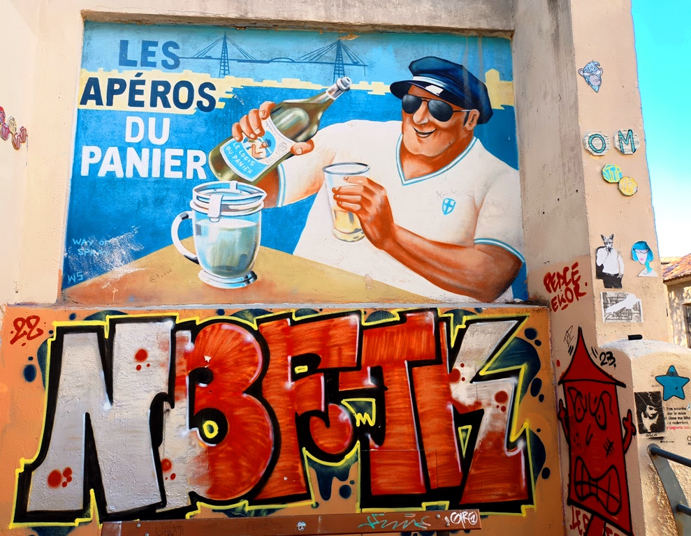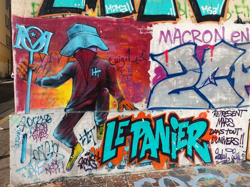 Le quartier du Panier est un vivier du street art marseillais. Certes, il a bien changé depuis les début des années 2000, lorsque le TGV est arrivé â la gare Saint Charles. Il s’est « boboïsé » et la mixité populaire, culturelle et ethnique haute en couleurs qui faisait sa particularité a laissé la place à des activités plus touristiques, telles que des boutiques de souvenirs, des savonneries, des ateliers d’artistes et des bar-restos. Il faut dire que le microcosme urbain du Panier, situé dans le 2e arrondissement, se prête sans problème à cette transformation avec ses multiples grandes places et placettes, son dédale de ruelles et ses nombreux escaliers, qui donnent à ce lieu – le plus vieux de Marseille, déjà habité pendant la période gréco-romaine – des allures de Montmartre-sur-Méditerranée.