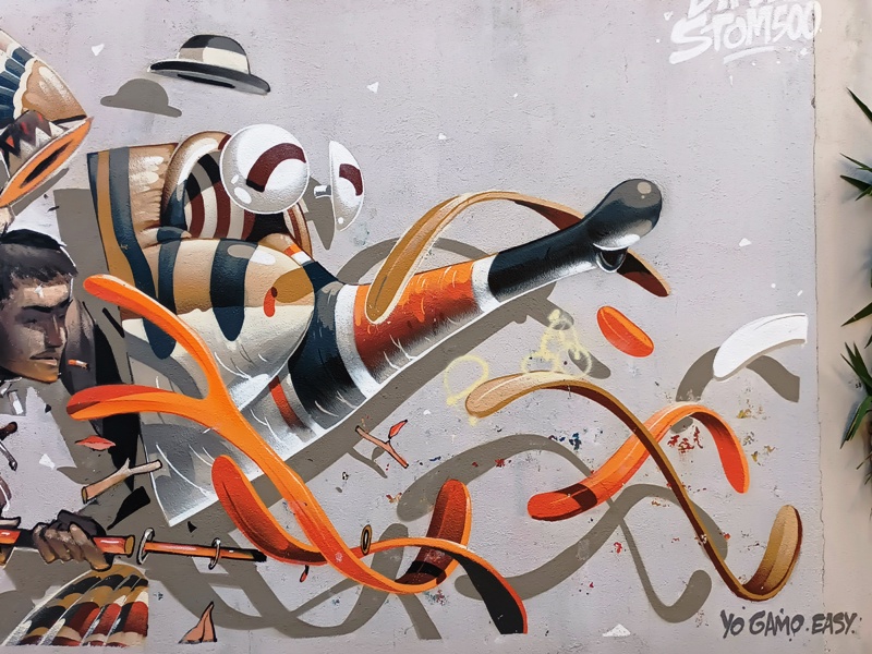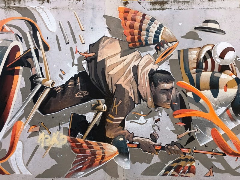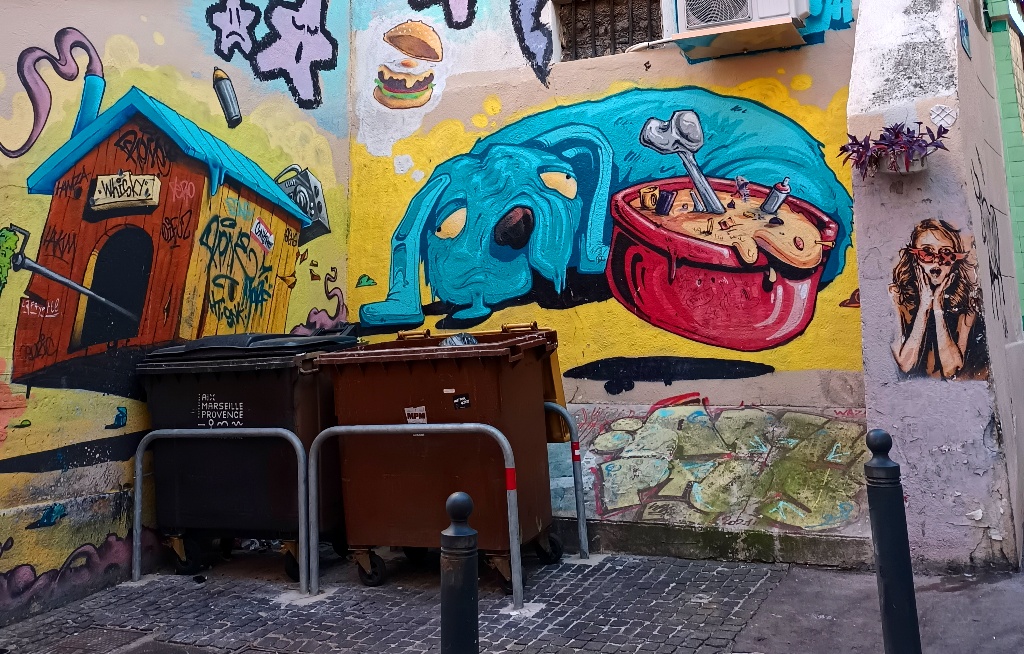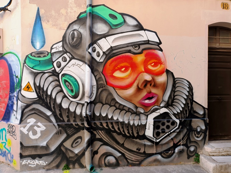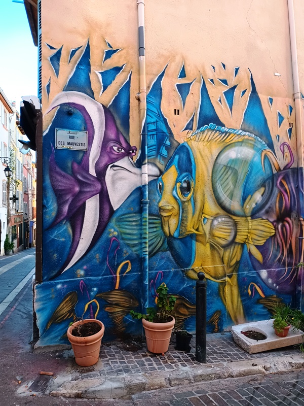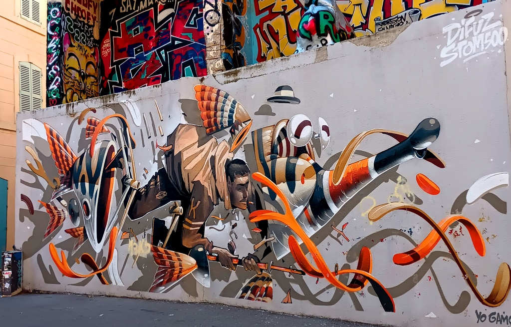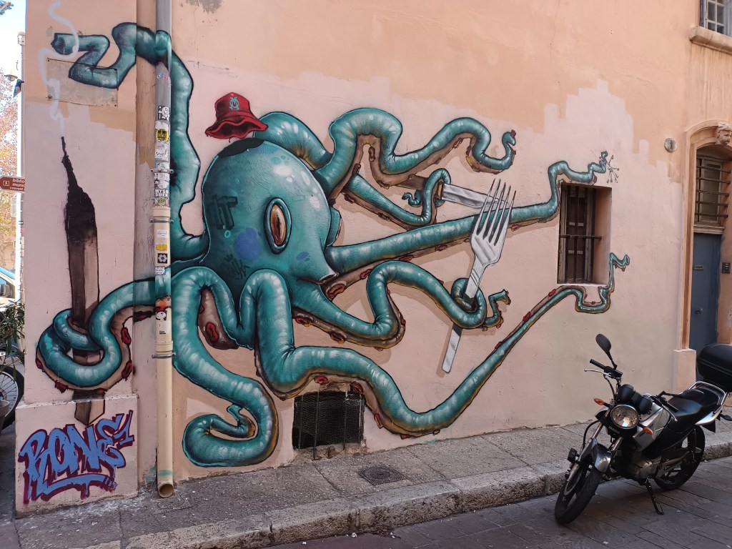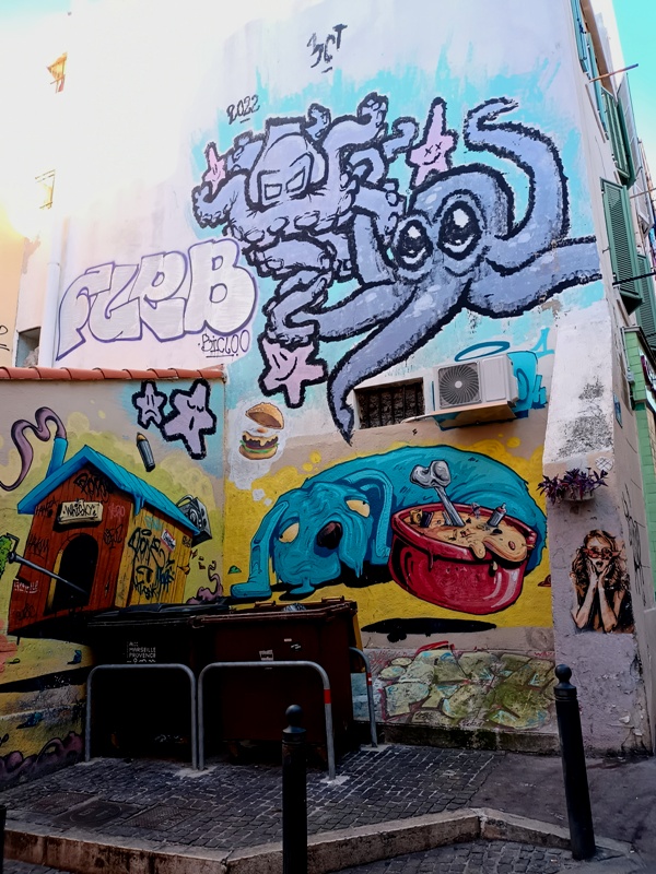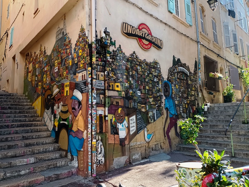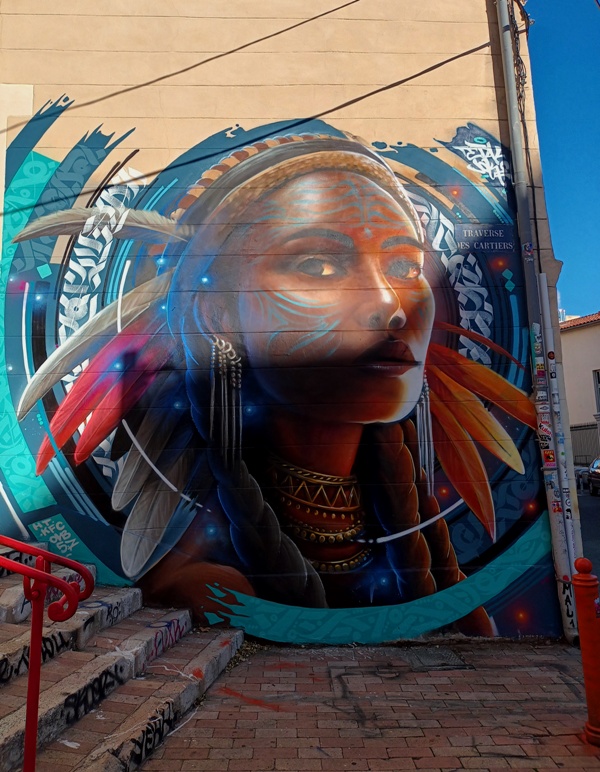 Le quartier du Panier est un vivier du street art marseillais. Certes, il a bien changé depuis les début des années 2000, lorsque le TGV est arrivé â la gare Saint Charles. Il s’est « boboïsé » et la mixité populaire, culturelle et ethnique haute en couleurs qui faisait sa particularité a laissé la place à des activités plus touristiques, telles que des boutiques de souvenirs, des savonneries, des ateliers d’artistes et des bar-restos. Il faut dire que le microcosme urbain du Panier, situé dans le 2e arrondissement, se prête sans problème à cette transformation avec ses multiples grandes places et placettes, son dédale de ruelles et ses nombreux escaliers, qui donnent à ce lieu – le plus vieux de Marseille, déjà habité pendant la période gréco-romaine – des allures de Montmartre-sur-Méditerranée.