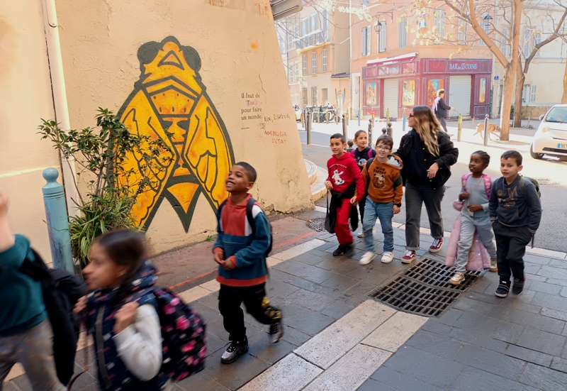 Un jour de semaine ensoleillé, je suis allé y photographier les œuvres que vous pourrez voir plus bas et dans la deuxième partie de cet article. C’était un mardi, le Centre de la Vieille Charité, qui recèle dans son exposition permanente des trésors archéologiques et historiques du pourtour méditerranéen, mais aussi d’Afrique, d’Océanie et des Amériques, était fermé. Il y avait, déambulant dans les rues vides de motos et de voitures ou assis aux terrasses des restaurants ouverts, peu de touristes. J’ai dû certainement croiser aussi quelques habitants du quartier ou de la ville, en plus des commerçants sur le pas de leur porte, mais ils étaient tellement discrets que je ne m’en suis presque pas aperçu. Ah, le moment le plus vivant fut quand j’ai entendu puis vu un groupe d’enfants accompagné de la responsable pédagogique faire un « tour street art » dans le Panier. Il faut dire que c’était un jour travaillé de décembre et qu’en 2023, toute la faune locale – familles d’origine italienne, gitane, maghrébine, subsahariennes débordant de leurs petits appartements sur la voie publique et décrite brillamment dans Cinq dans tes yeux de Hadrien Bels, publié aux Éditions L’Iconoclaste en 2020 – s’est volatilisée depuis longtemps. Le Panier était usque dans les années 1990 un quartier mal famé où il ne faisait pas bon se promener seul le soir, ou même en journée. Il avait ses codes et ses communautés qui se toléraient, mais restait isolé sur les hauteurs de Marseille, souvent balayé par le mistral et les vents marins. Aujourd’hui c’est toujours une zone relativement populaire, mais la dynamique de survie entre habitants a évolué vers une entre-aide bon teint entre nouveaux arrivants et propriétaires. Même si, sous le nouveau vernis, les trafics et mafias locales restent en place…