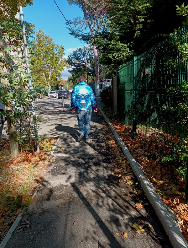 Un agent de nettoyage fait s’éparpiller les feuilles de platanes craquantes sous les pas et des emballages plastiques de toute sorte, à gauche puis à droite de sa silhouette. Il semble manier son souffleur comme un jouet léger. Les déchets organiques, inorganiques s´élèvent d’un mètre ou deux et retombent dans son dos tandis qu’il avance dans un mouvement mécanique, puis disparaît.