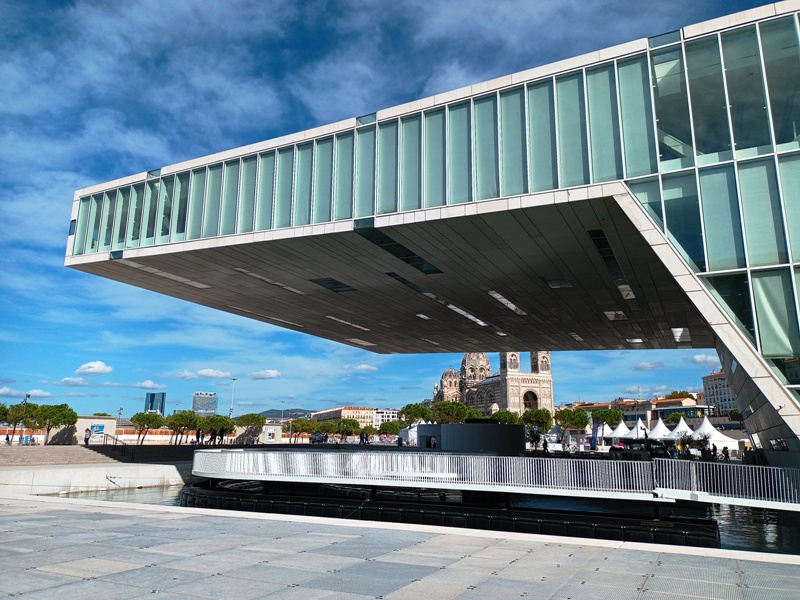 Crée en 2013 par Norman Foster, le paysagiste Michel Desvigne et Tangram Architectes (basés à Marseille), l’Ombrière du Vieux-Port vole comme une feuille d’aluminium au dessus du quai de Rive Neuve baptisé « quai de la Fraternité ». C’est une petite merveille ! Une prouesse technique, tout d’abord, car la structure supporte un toit-miroir de 1000 m2, et tout en finesse, s’il vous plait, puisqu’elle réussit à se fondre dans le paysage, mieux même, elle lui donne de la perspective. L’effet visuel du plafond-miroir est saisissant. Étonnant et éblouissant ! marseille.city-life.fr
