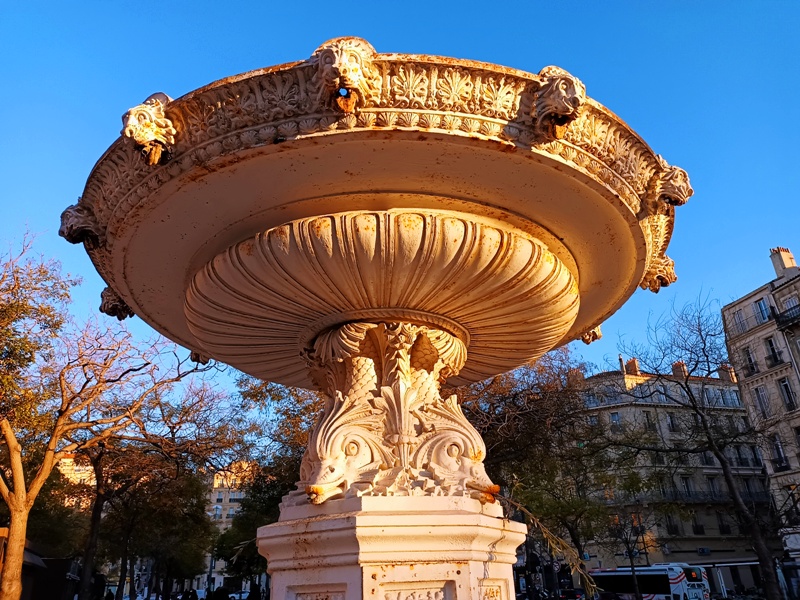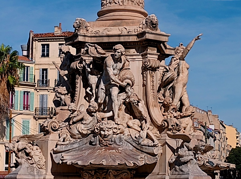 Voilà, j’ai tout dit de mes impressions marseillaises. J’ai même débordé du cadre de cette ville, car Marseille c’est aussi une France en concentré. Son destin régional a toujours fait le pas de deux avec celui plus largement national. D’ailleurs, « La Marseillaise » est bien devenu l’hymne de l’Hexagone depuis la Révolution. L’imagerie républicaine est partout présente sur les édifices de la cité, et les visages de Marianne, les grandes figures de notre histoire et destin communs issues des Arts et des Sciences se mêlent aux motifs d’inspiration maritime, sur les bas-reliefs des monuments commémoratifs, et dans les compositions sculpturales des fontaines.