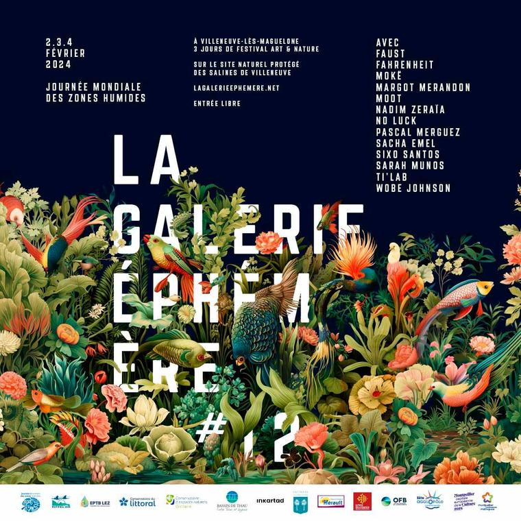 La Galerie éphémère est une manifestation hybride qui a pour ambition de provoquer la rencontre des amoureux de la Nature et des amateurs d’Art. Au programme : illustrations, photographies, peintures, vidéos, graffitis, théâtre, musique, danse, ateliers de sensibilisation et visites guidées à la découverte de la biodiversité qu’abrite l’espace naturel d’exception les Salines de Villeneuve-lès-Maguelone. Ce festival porté par le Conservatoire d’Espaces Naturels en Occitanie, artistiquement dirigé par l’association INKARTAD, s’inscrit dans le cadre de la Journée Mondiale des Zones Humides.