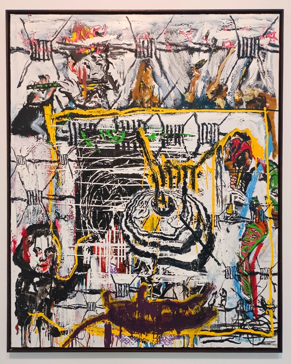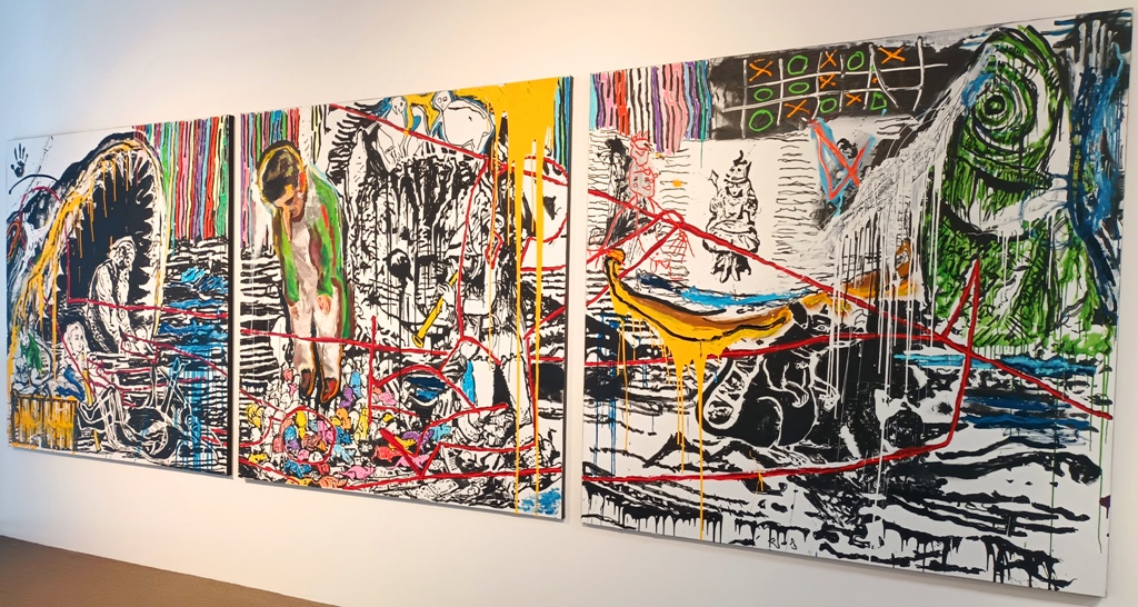 Avec un nouveau groupe d’amies, je suis allé découvrir au Musée Paul Valéry à Sète l’exposition d’Orsten Groom intitulée Rétrospective – Volcan du coma, dont c’était un des derniers jours. Un bouillonnement de toiles aux couleurs et au graphisme violent, un déferlement eschatologique inspiré principalement de la Kabbale juive, la Bible et les contes pour enfants. Les visiteurs apprennent entre autre de l’artiste que, « né en 1982 en Guyane d’une famille polono-russe, Orsten GROOM (Simon Leibovitz-Grzeszczak) subit une rupture d’anévrisme en 2002, qui le laisse épileptique et amnésique. Apprenant pendant sa convalescence qu’il est peintre, il réintègre les Beaux-Arts de Paris, dont il sort diplômé en 2009 (ateliers de François Boisrond et de Jean-Michel Alberola) et du Fresnoy – Studio des arts contemporains en 2011. ». Des lunettes 3D sont délivrées avec le ticket d’entrée de l’expo, afin que le regard plonge encore plus profondément dans les peintures. Ce truc fonctionne en fait avec n’importe quel dessin, peinture, collage, fresque et même mosaïque : le rouge magenta et les couleurs chaudes surgissant en premier plan, le bleu et les couleurs froides s’éloignant dans le fond. Le noir et le blanc semblent vouloir rester en place, mais il faudra que je retente cette amusante expérience !