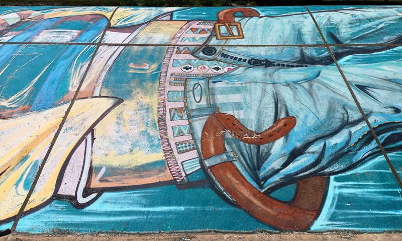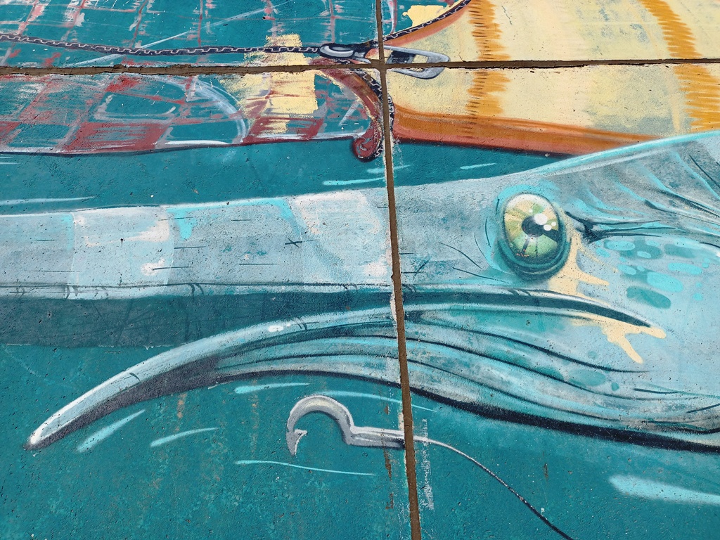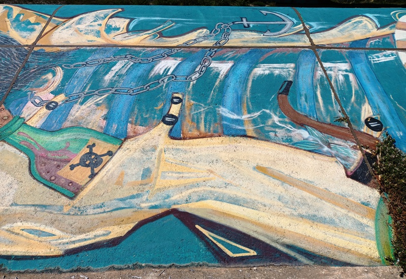 Dans une nuance de bleu-vert et d’ocres, elle s’étale toute en longueur et de biais par rapport au sol, ce qui a obligé les artistes intervenants à d’intéressantes anamorphoses pour la composition générale. Au centre, une sorte de géant marin-pirate un peu halluciné semble se couler dans le format et dans le courant du Lez, qui finit son aventure quelques kilomètres plus loin à Palavas dans la mer Méditerranée. Il est entouré de détails sinificatifs dont d’amusants animaux marins et brandit au dessus de sa tête un sabre signé « ROGER » de ses deux mains. On note une inspiration d’Albert Dubout et des références à son oeuvre. Cet artiste originaire de Marseille a rendu célèbre avec ses caricatures « le Petit Train de Palavas » qui passait non-loin et faisait aller-retour entre Montpellier et Palavas de 1872 à 1968.