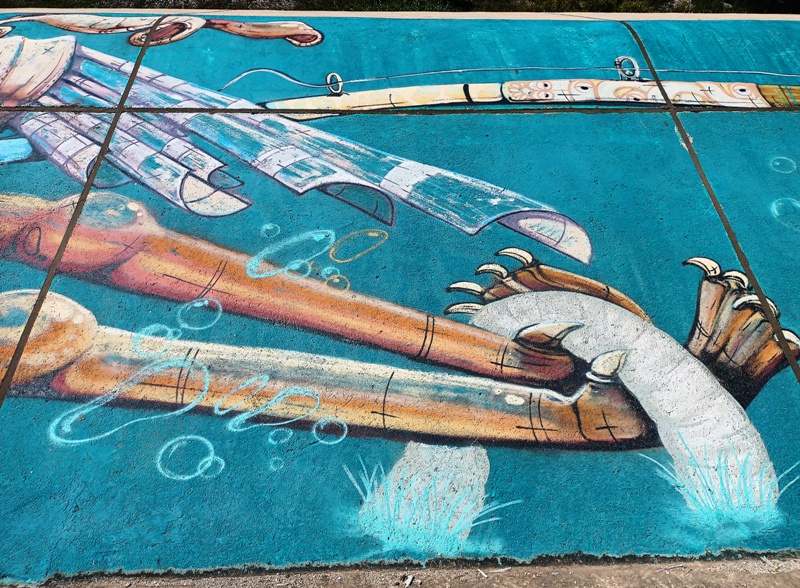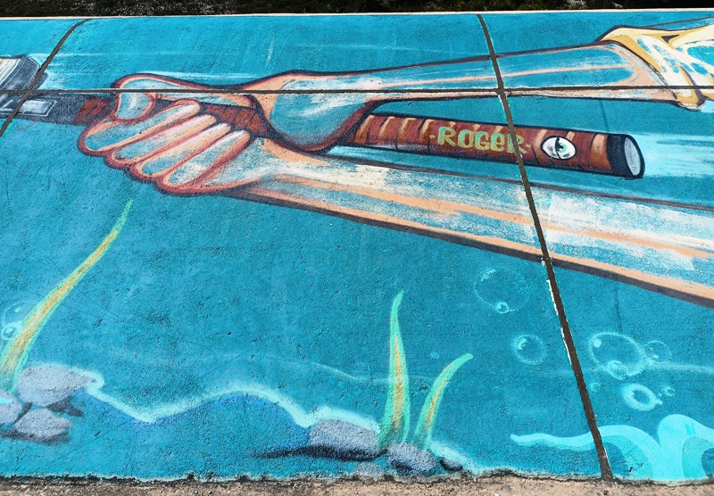 Impossible à photographier dans sa totalité (la fresque doit faire dans les 150 mètres de long sur 3 mètres de large environ), je l’ai photographiée en différentes parties, dans lesquelles se révèlent des détails humoristiques. Cette œuvre qui a l’air d’être collective est signée « SuPoCaOS ».
