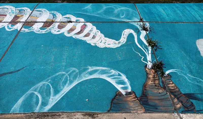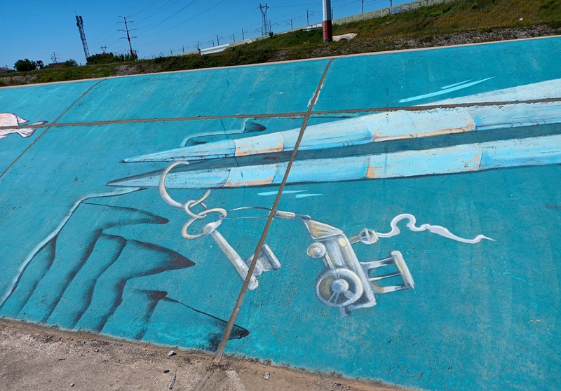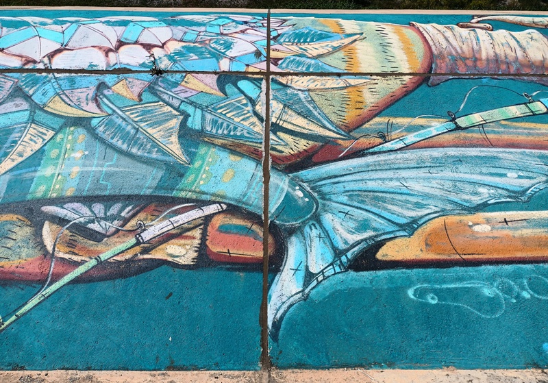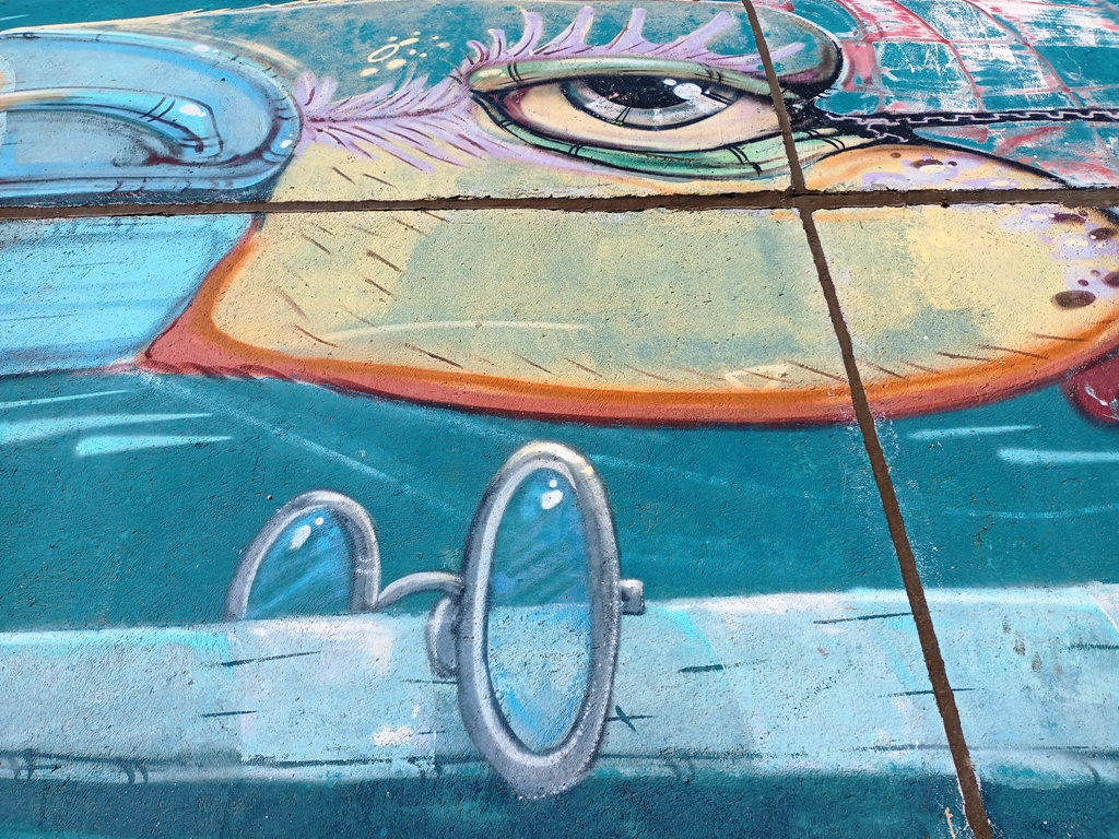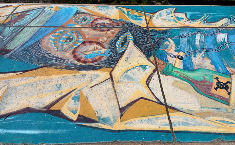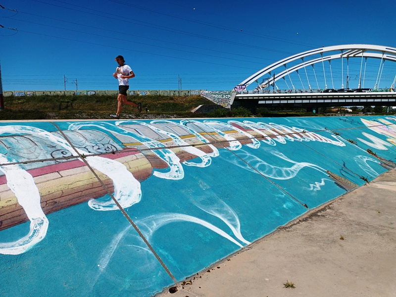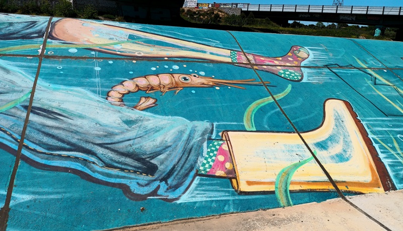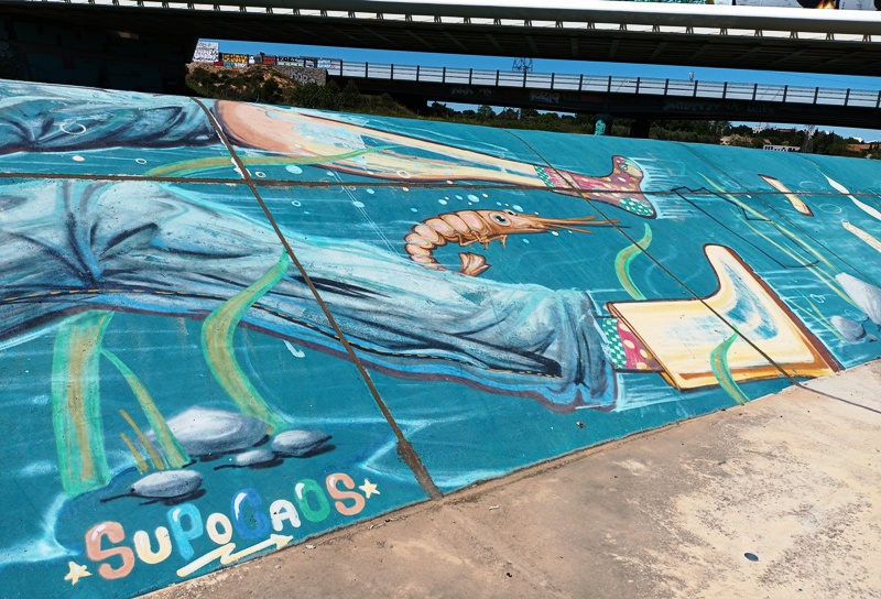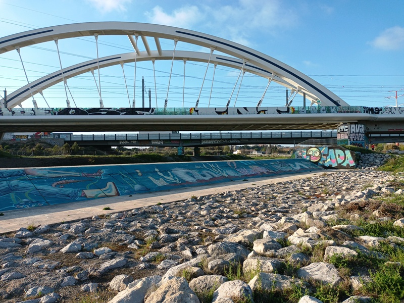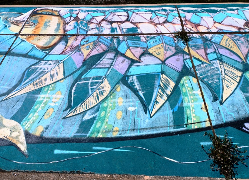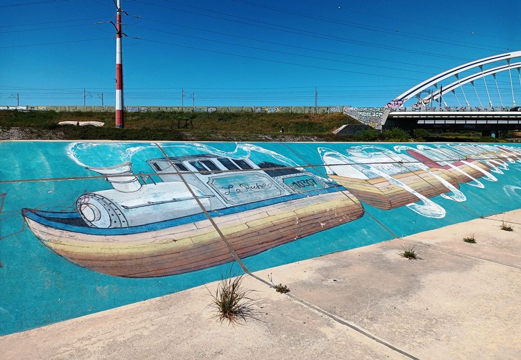 La déferlante street art reste légère à Montpellier, particulièrement dans le centre-ville historique qui est précieusement entretenu et nettoyé depuis déjà bien longtemps pour un public choisi. Certes, certaines fresques monumentales de commande municipale y sont bien réalisées mais peu originales en général – ces trompe-l’œil au style lourd et démodé qui ornent certaines façades lle et que je ne présenterai pas ici. Peut-être faut-il parler de vagues polymorphes, tant les propositions sont hétéroclites. Ce sont plutôt des petits formats, peintures, pochoirs ou collages, qui ont attiré mon attention et qui font l’objet des deux articles Montpelier street art suite et fin. C’est au niveau du Viaduc du Lez que j’ai trouvé matière à faire cette première publication. Dominée par le splendide pont métallique ferroviaire de 600 mètres en forme d’arc blanc (on peut aussi imaginer deux roues gigantesques de vélo semi-enterrées), une longue fresque orne les berges du Lez sur sa partie prévue pour le déversement des eaux de la rivière, en cas de très fortes pluies.