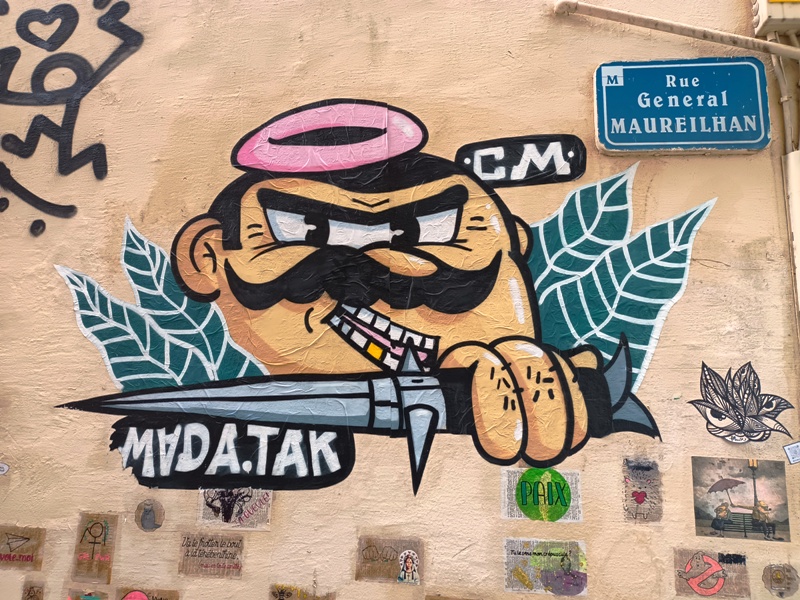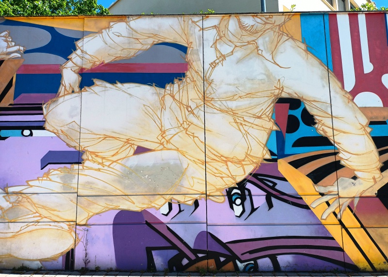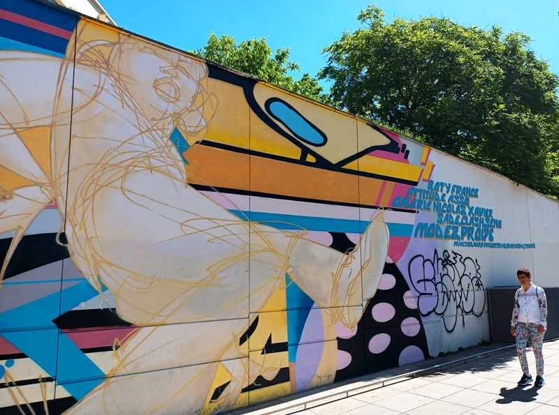 - Une fresque fraîche et tonique sur le thème du hip hop et de facture professionnelle, située rue du Pont de Latte, le long de la ligne 3 du tramway, un peu après avoir traversé les voies de la gare Saint Roch. Beaucoup d’intervenan, la fresque est signée Boty France / Attitude Asso / Galerie Nicolas Xavier / Sade / Clash / Seno / Mode 2 / Pro176 – Françoise, Marianne, Bertrand, Erwin, Nubian, Thomas.