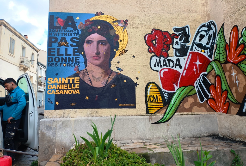 Près de la gare, je suis passé juste avant que l’agent de nettoyage municipal n’élimine Sainte Danielle Casanova nichée dans l’angle d’un bâtiment officiel de ce monde réel… ou pas !