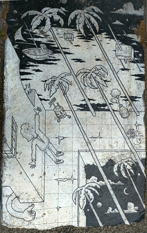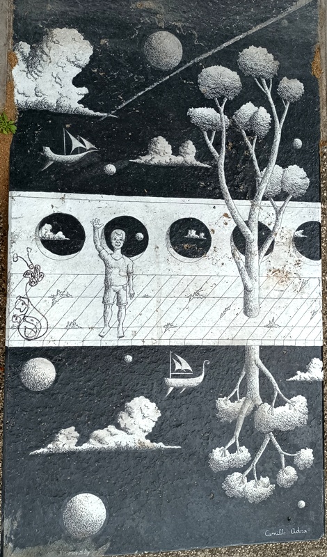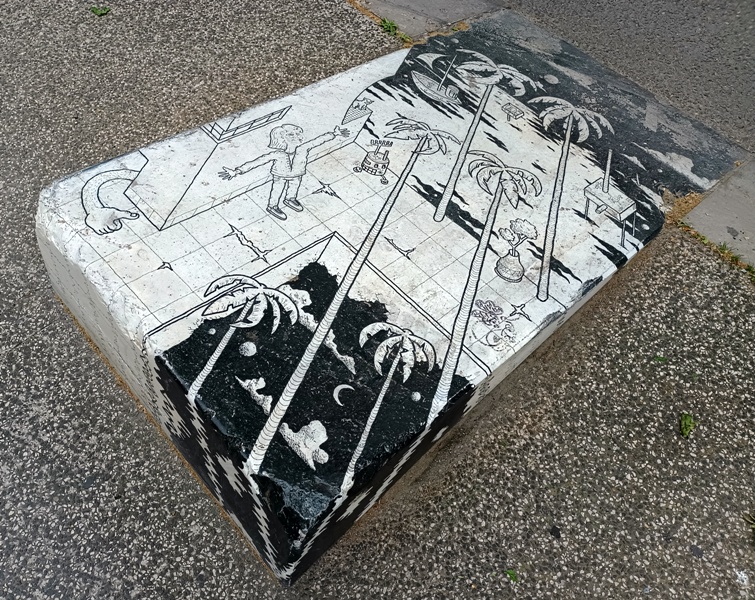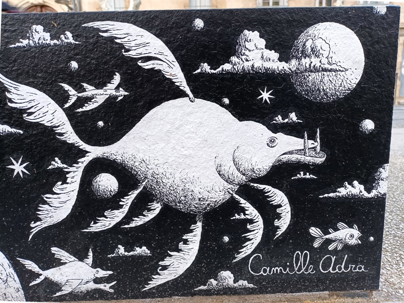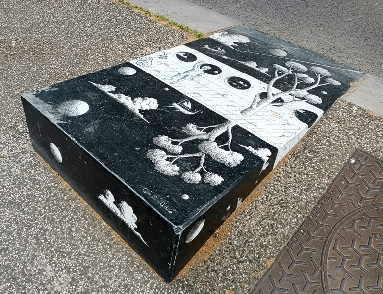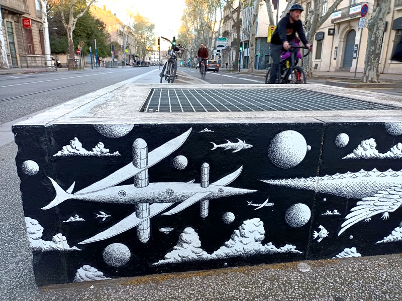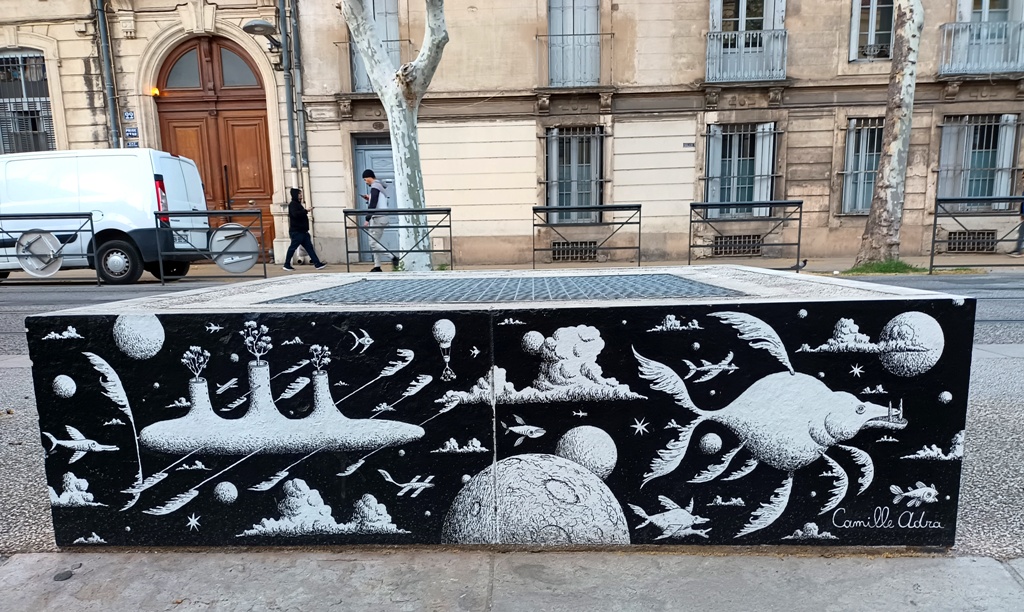 - Une bouche d’aération souterraine et des piles de béton ponctuant les voies de la ligne 3 sur le boulevard Gambetta deviennent des supports à de délicates illustrations en noir et blanc, inspirées des fonds marins, de piscines et d’exotisme, signées Camille Adra