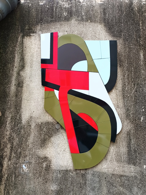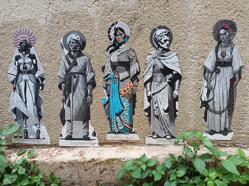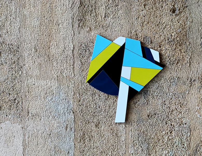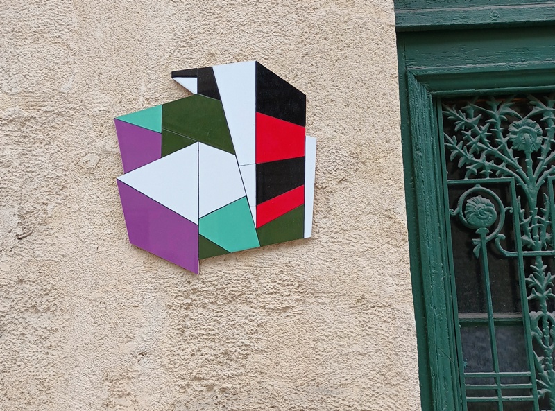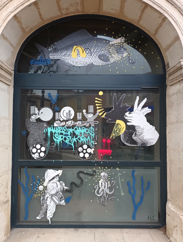 - Une composition sur la devanture d’une banque fermée, par l’association Odette Louis à Celleneuve.