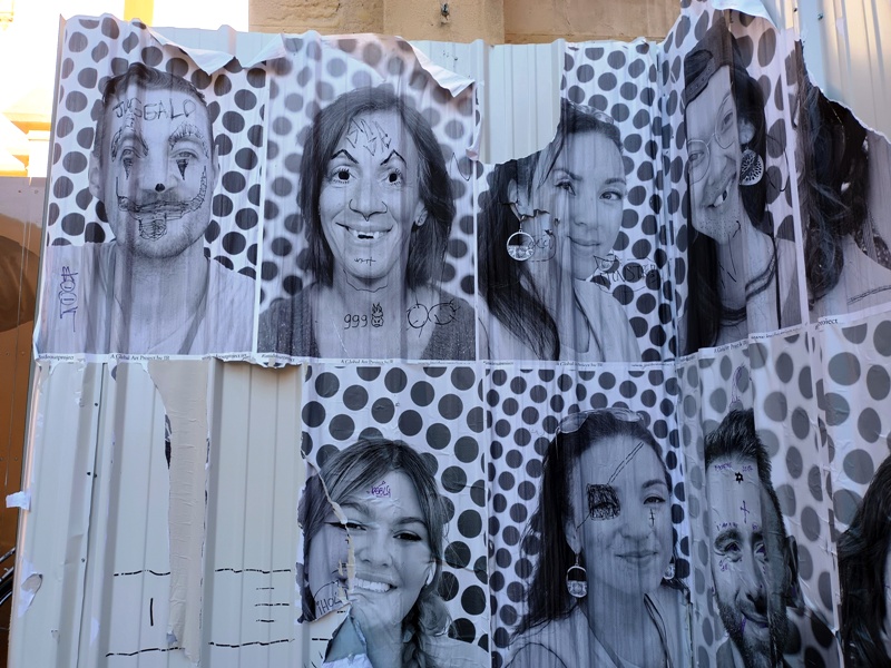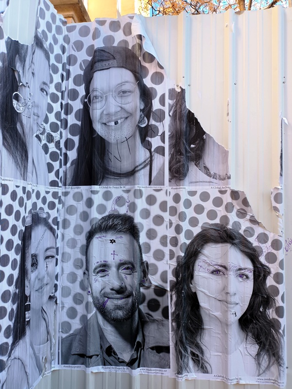 - Des photocopies grand formats de portraits par JR collées sur les palissades disposées autour de l’élise Sainte Anne en rénovation ont été complétées avec humour par des anonymes, ce qui leur donne un style moins standardisé et plus urbain