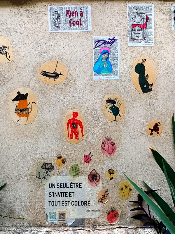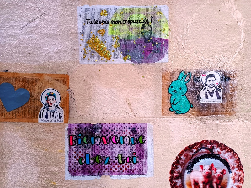 - La mode est aux collages et compositions de stickers ; sur certains, ont peut lire « Tu les sens mon crépuscule ? / Bienvenue chez toi / Un seul être s’invite et tout est coloré »