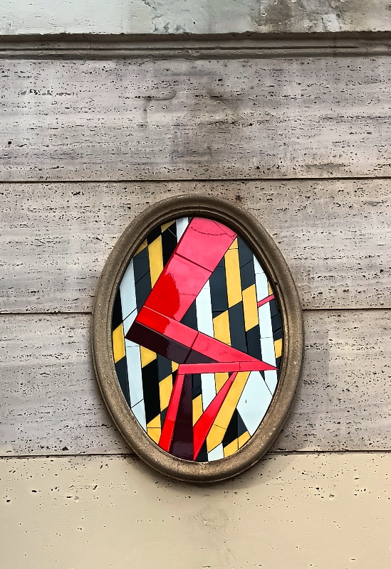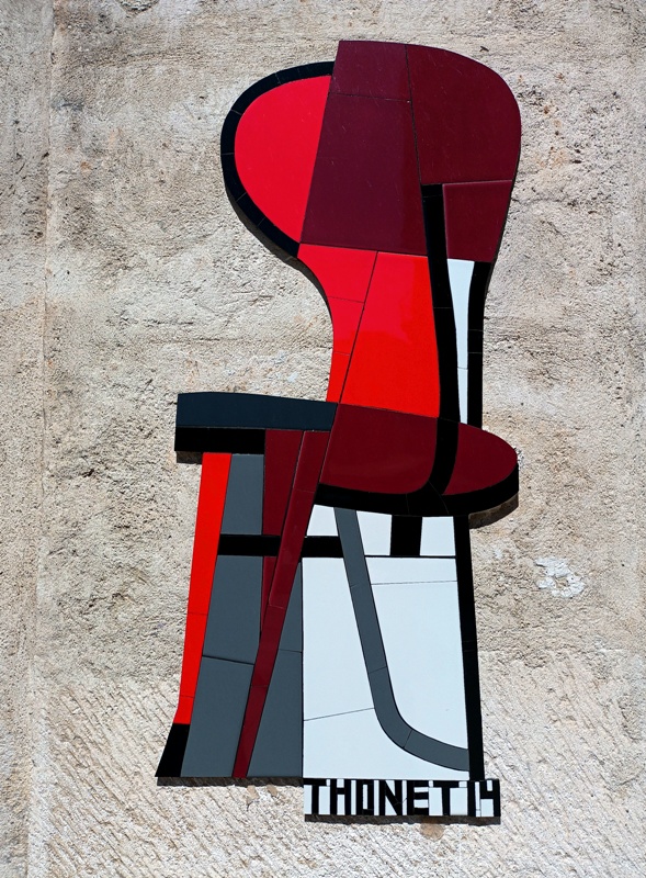 - Des compositions géométriques, faites avec des collages de carreaux de couleur émaillés et découpés façon mosaïques, collées durablement sur des murs. Une seule de la série est signée « Thonet14 ».