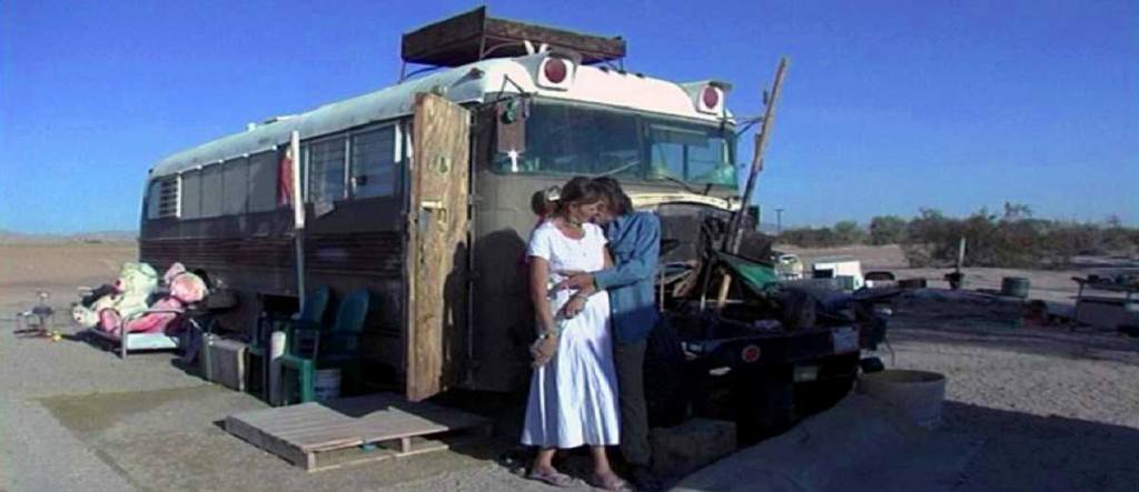 « À 190 miles au sud-est de Los Angeles et 120 pieds en dessous du niveau de la mer, près de Salton Sea, en plein désert, sur le site désaffecté d’une ancienne base militaire et à proximité d’un centre de tirs aériens, s’étend Slab City, vaste camp de caravanes, de tentes, de mobil homes, d’autobus déglingués, de pick-up et de quelques cabanes. Là, vit une communauté de marginaux sans eau ni électricité, c’est-à-dire sans police ni gouvernement.