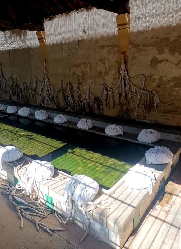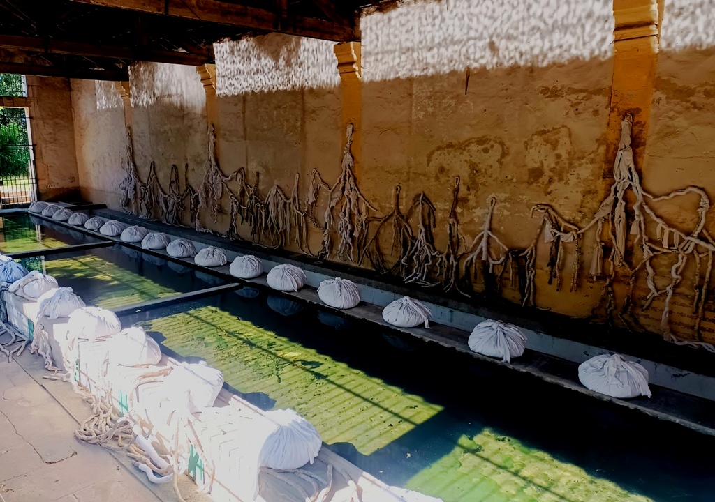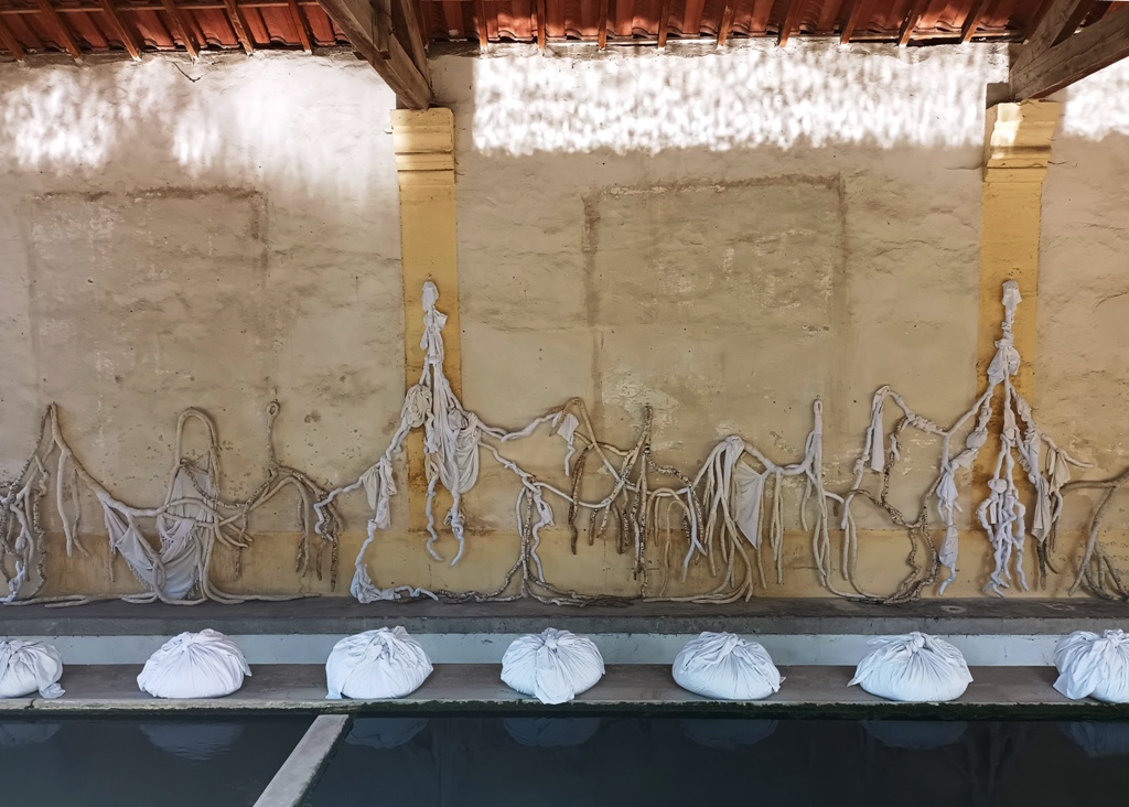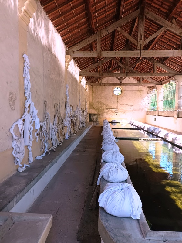 L’installation proposée par l’artiste Isa Rabarot du 7 juin au 30 juillet peut se voir à l’intérieur du grand lavoir d’Aubais, qui date du milieu du XIXe siècle, Celui-ci est est situé aux portes de la ville, chemin de Junas. Il est fermé par des grilles métalliques, aussi l’installation se contemple depuis l’extérieur. Elle s’intitule « Les voix de l’eau ». La présentation de cette œuvre sobre et réussie conclut cet article avec quelques photos et un texte explicatif de l’artiste, qui vient justement en résonance avec le thème de l’eau abordé ici.