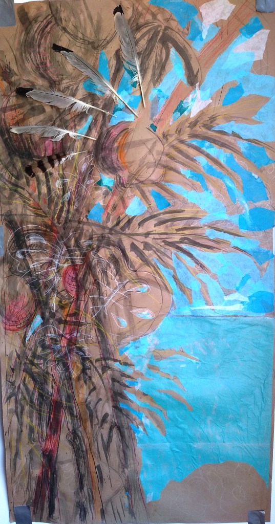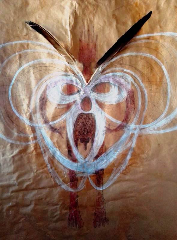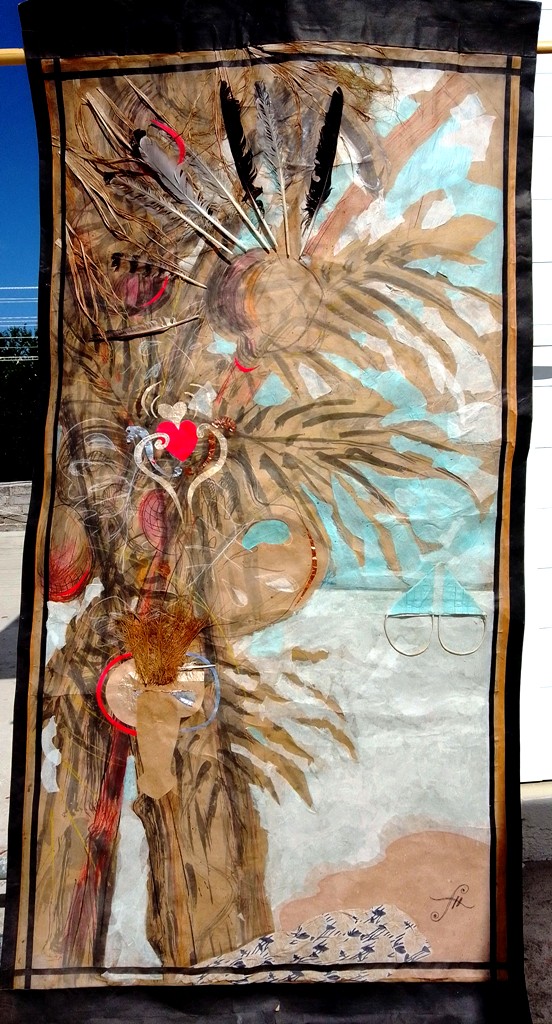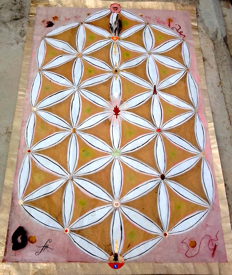 Légende des photos, copyright Florent Hugoniot : « Chaman », collage, encre de Chine et dessin sur papier kraft, étape 1 et 2, recto/verso – Autel à ma mère – Cuidame / Prends soin de moi – Au temazcal de Firmin, Oaxaca – IN LAK’ECH – HALA K’IN – Lámpara gran caracol / Lampe conque marine – Lampe sacrifiée au feu – Coucher de soleil sur le Pacifique avec Siena – Oaxaca solaire – Dessin à l’encre et au Bic pour une cérémonie du feu – « Ondes d’eau » peinture et collage sur kraft -ci-dessous : « La vie en rose »