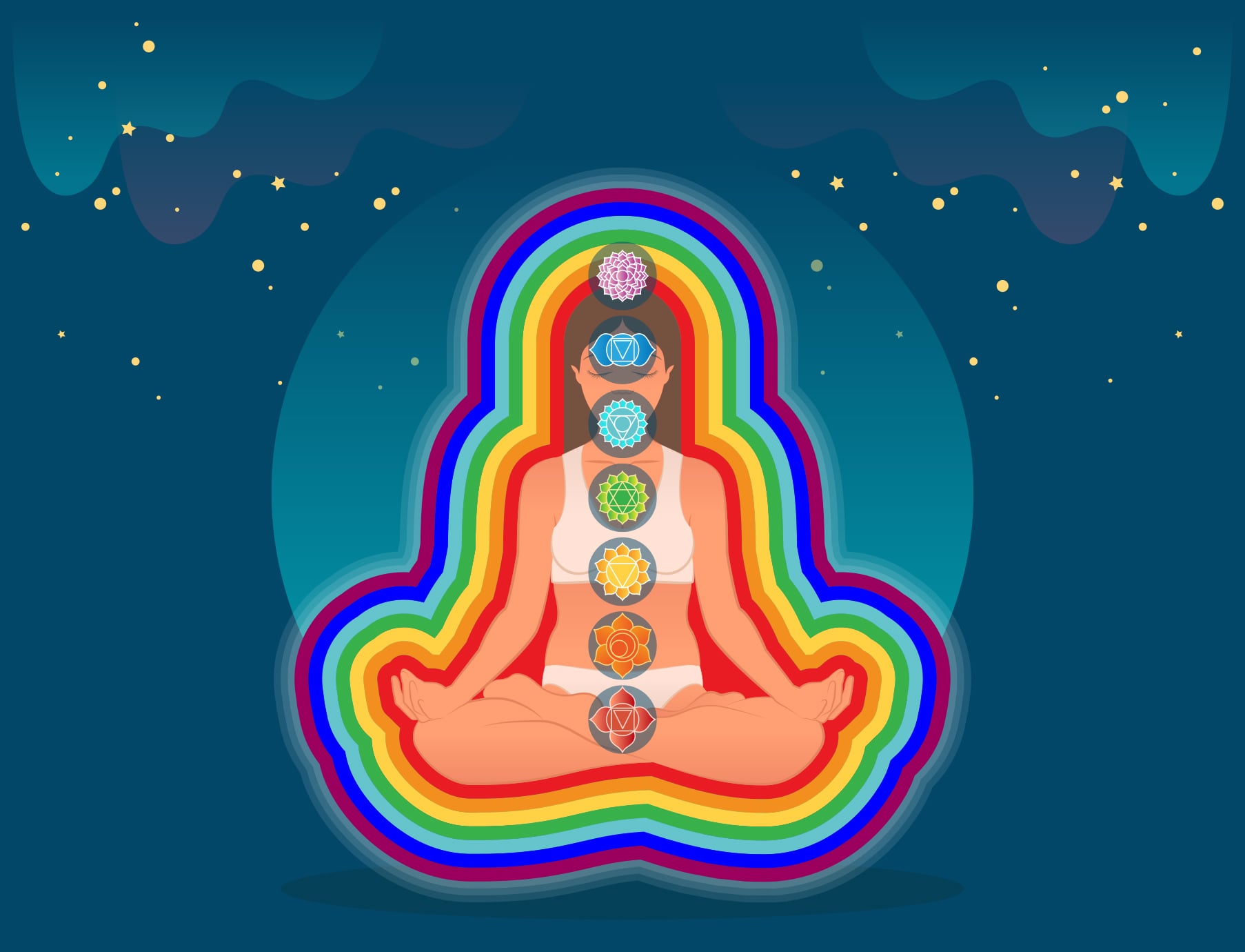 Au niveau du corps physique, nous avons des centres d’énergie que l’on appelle Chakra. Chaque chakra, également au nombre de 7, est en lien de manière énergétique avec les 7 corps allant du moins au plus subtil et qui entourent le corps physique. Ils interagissent les uns sur les autres, comme des informations qui seraient transmises par des ondes. Chaque chakra est également en affinité vibratoire avec les éléments (Terre, Eau, Feu, Air, Espace), avec des couleurs, des odeurs, des saveurs et avec des sons.