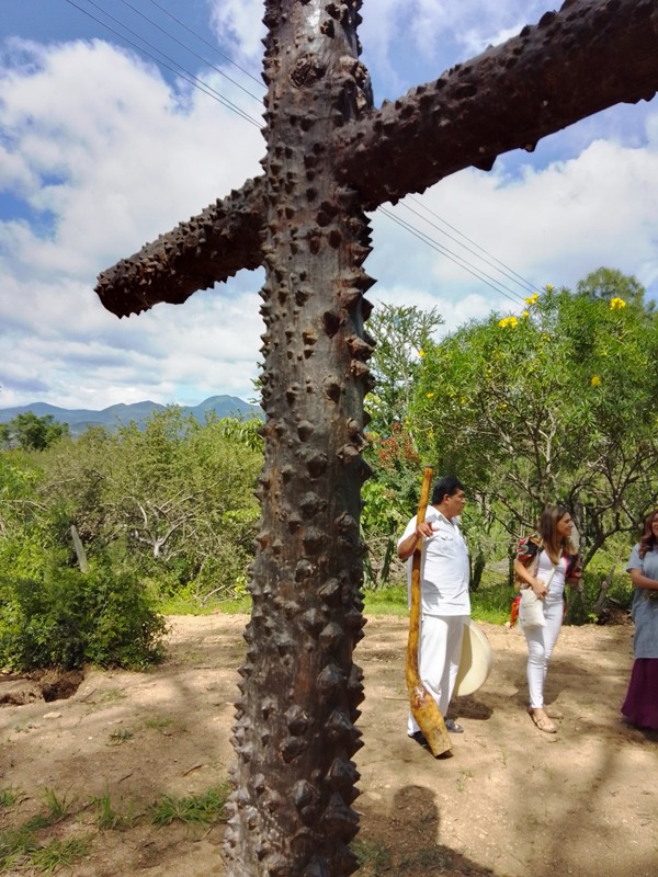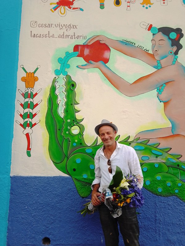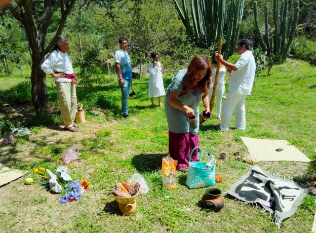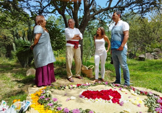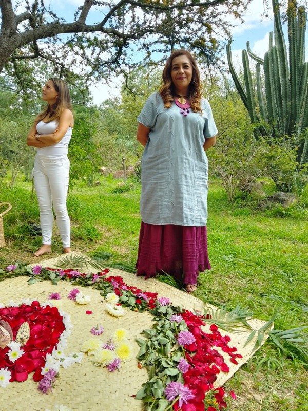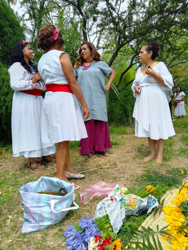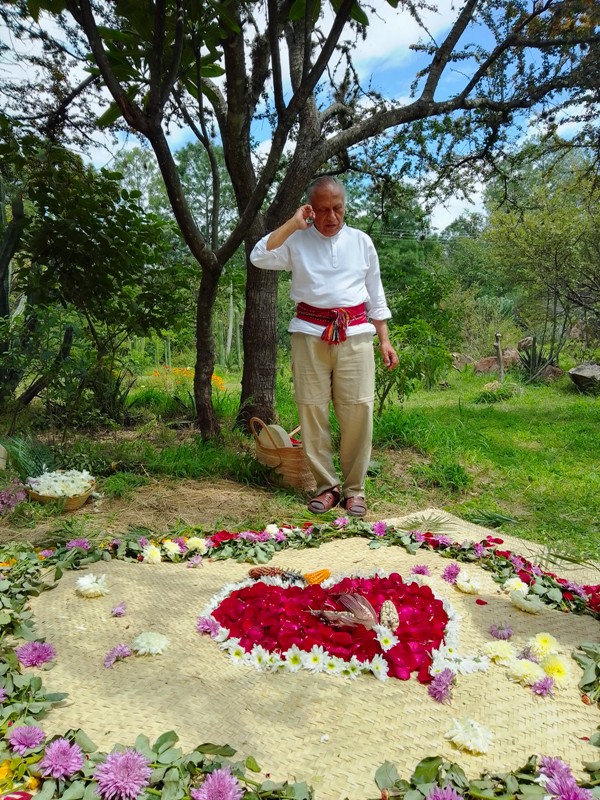 Cette cérémonie de l’équinoxe d’automne 2021 a suivi d’une semaine celle du cacao. Elle s’est déroulée dans le magnifique parc d’un domaine privé aux environs de la ville de Oaxaca, au nord-ouest dans la direction de Santa Maria Atzompa. Invité par la curandera Myriam, je suis venu en transport en commun habillé de clair et avec un bouquet de fleurs comme indiqué. M’étant un peu égaré en chemin, je ne suis arrivé qu’à la fin de la cérémonie. J’ai cependant pu me joindre à ce moment particulier et faire quelques photos sous une lumière sublime. Le petit groupe d’une douzaine de personnes réunissait des Mexicains de provenance diverse : les officiants étaient oaxaqueños, les invités venaient de la capitale ou de Guadalajara.