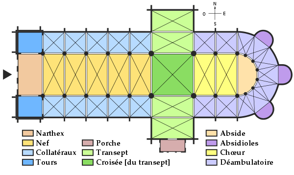 La nef est la partie de l’église comprise en longueur entre le portail et le transept (ou le chœur)et délimitée en largeur par les deux rangées de piliers soutenant la voûte. Au centre de l’église, elle est dite principale, c’est le plus grand espace de l’ensemble.