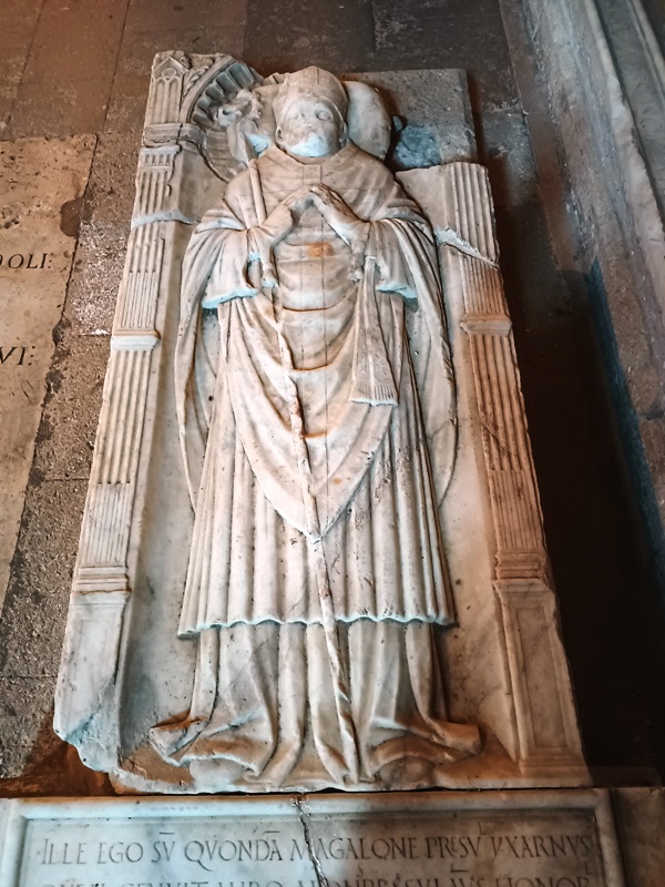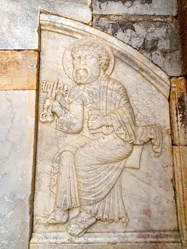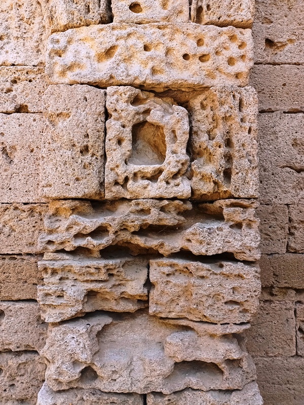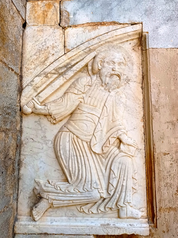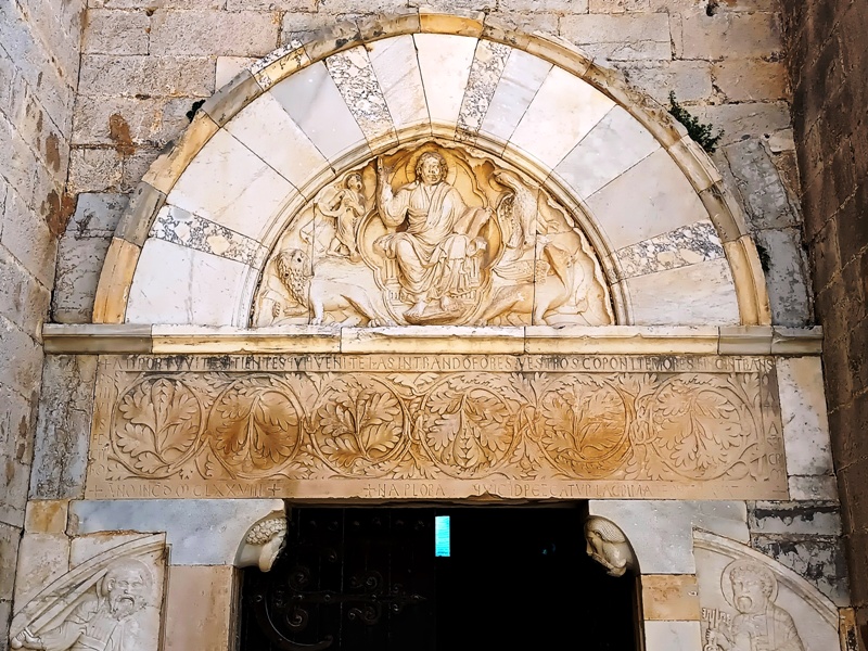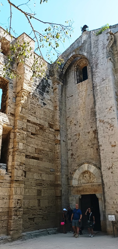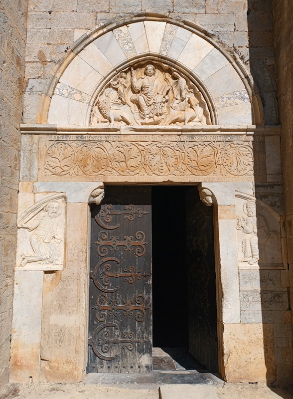 Dans l’ordre, la porte d’accès Nord à l’île datant du XIXe siècle – le portail sculpté de la cathédrale – murs extérieurs Est – l’intérieur, chœur, nef et transept, plateforme du premier étage – escalier menant au premier étage, marches aménagées en fonction des pas de la mule papale – autel à la Sainte Vierge – stèles de quatre ecclésiastes – porte principale – mur extérieur en calcaire coquillier érodé – Chapelle Sainte Blaise – vues de l’île avec ses terrains agricoles, ses vignes