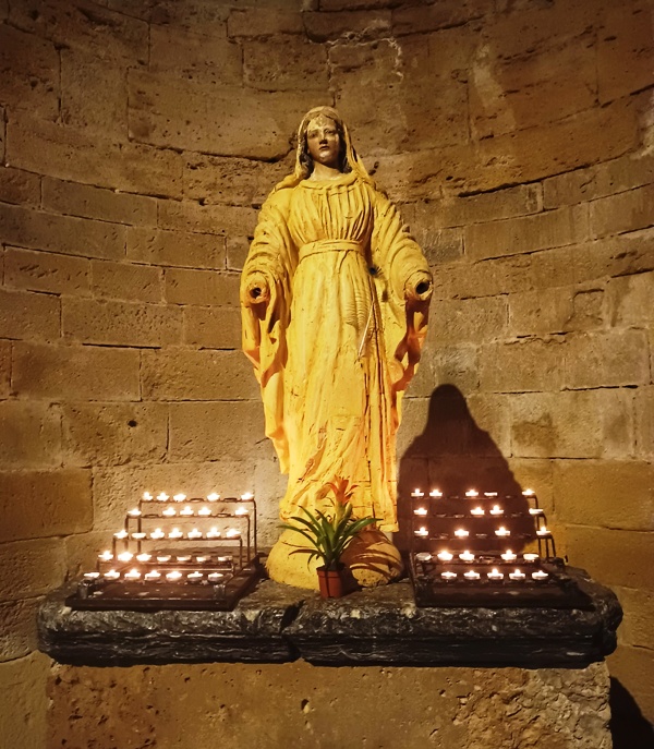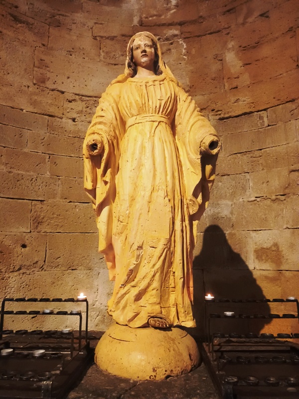 Dans la douce pénombre rafraichissante de la cathédrale, de plus en plus de lumignons sont allumés aux pieds de la statue en plâtre de la Sainte Vierge datant de l’époque baroque. Ses deux bras font un geste d’accueil aux passants et pèlerins ou d’imploration pour la miséricorde divine, mais restent amputés de leurs mains. Dans le parc boisé de pins et agrémenté de massifs d’acanthes qui entoure la divine demeure, des paons bleu-vert ou blancs lancent régulièrement leur cri plaintif qui s’entend des lieues à la ronde.
