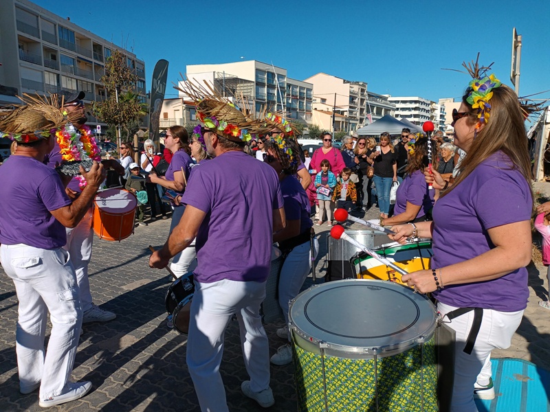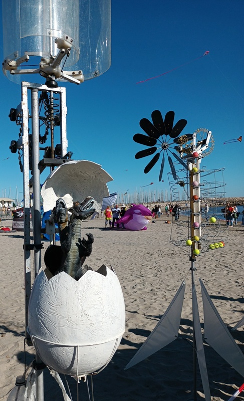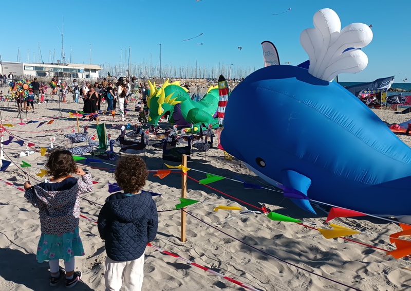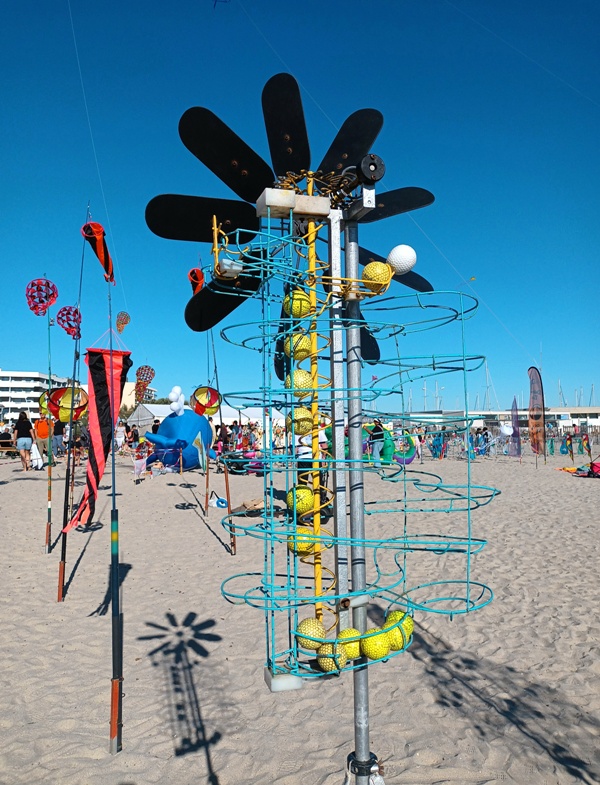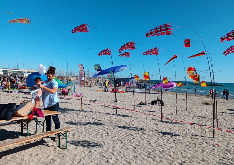 Rendez-vous des petits et grands, c’était l’occasion ce week-end d’octobre de s’évader, vivre un moment de liesse collective, respirer à pleins poumons en faisant des exercices de rotation de la tête qui détendent les cervicales, s’émerveiller de l’ingéniosité de ces objets célébrant Éole, dieu du Vent, et se perdre du regard dans l’immensité du ciel azuréen. Des cerfs-volants de toutes les tailles et aux inspirations diverses (oiseaux, poissons, spectres, squelettes, pirates, chats, cheval bleu, raies manta, animaux surréalistes, formes géométriques, animalerie échappée des cartoons, mangas, films d’animation infantiles et autres Snoopy, Mickey, Super Mario, Spiderman, une licorne et une baleine échouées…) mais aussi des drapeaux et des éoliennes décoratives de tous styles plantées dans le sable formaient un paysage ludique, multicolore et transparent sur la plage de Palavas. Des familles, beaucoup d’enfants avec des yeux gros comme des soucoupes, des groupes d’amis, une batucada rose fuchsia, des animateurs la parcouraient sans heurts, avec le sourire aux lèvres. D’ingénieux petits manèges animés par la force du vent faisaient l’admiration de tous. La fluidité dans les déplacements de foule conférait une intensité de vie presque sacrée à cette étendue de sable posée entre ciel et mer.