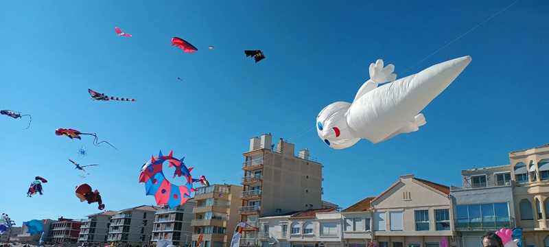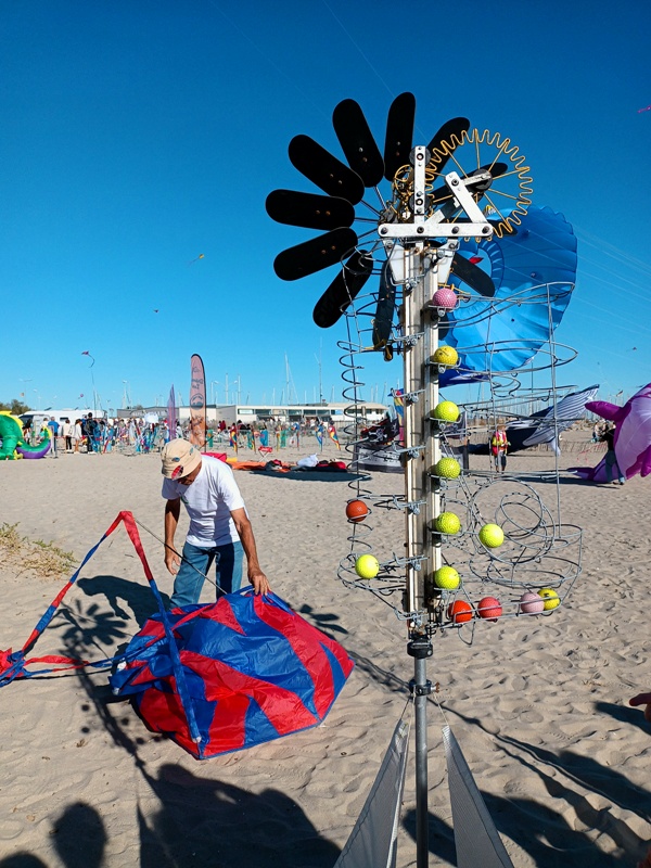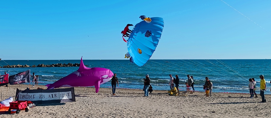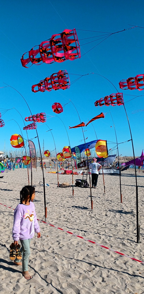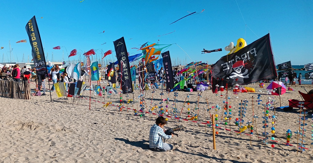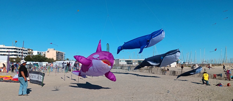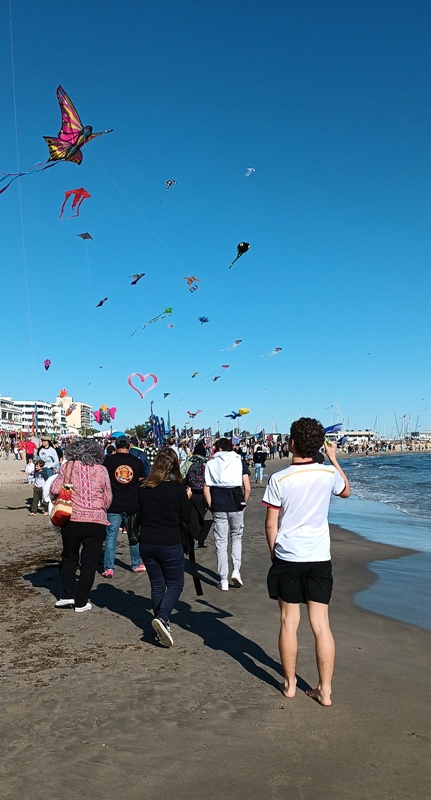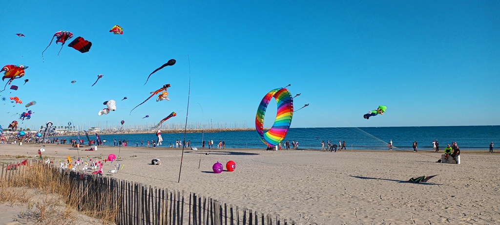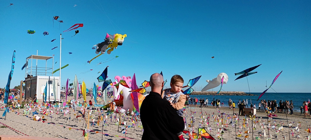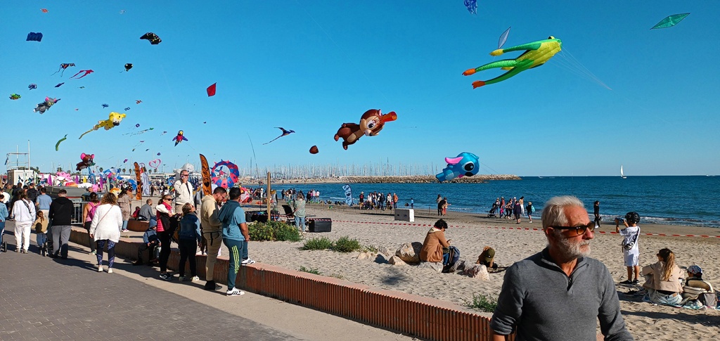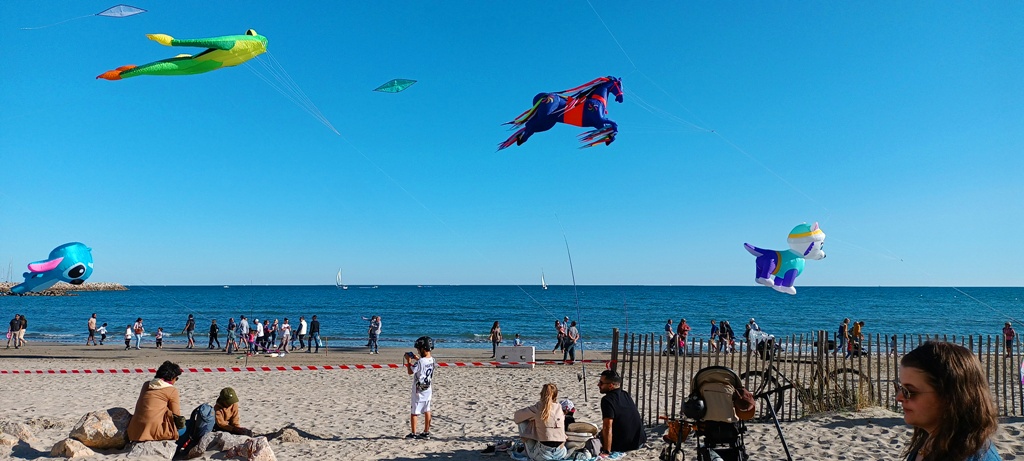 Du vendredi 4 Octobre au dimanche 6 Octobre 2024 avait lieu le festival annuel des cerfs-volants à Palavas-les-flots, Sans rien savoir de cet événement, quelle lumineuse idée j’ai eu d’y passer le samedi, jour de plein soleil et de vent d’ouest modéré.